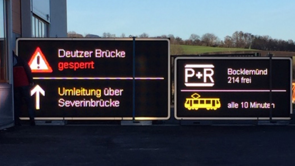 Unser Verkehrsleit- und Informationssystem besteht aus 27 Informationstafeln, die an den Hauptzufahrtsstraßen nach Köln stehen. Mit diesen Tafeln informieren wir Sie über die aktuelle Verkehrslage und geben wichtige Hinweise. Dazu gehören Informationen zum fließenden Verkehr, zum Parken und zum öffentlichen Personennahverkehr sowie Hinweise auf Baustellen und Veranstaltungen.