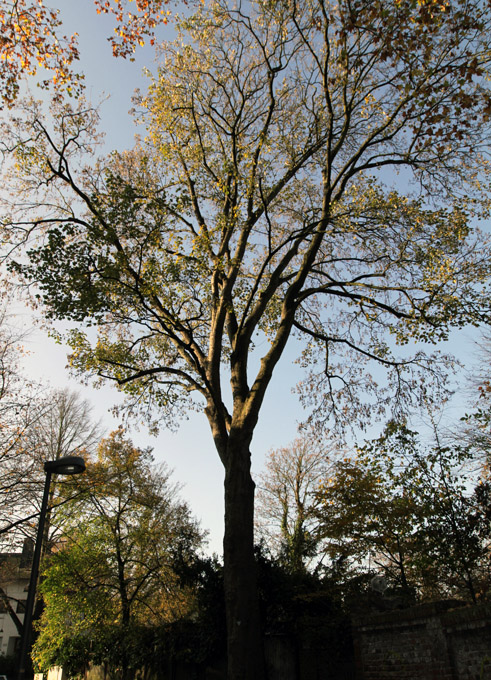 Der Bergahorn ist, wie die Platane des Nachbargrundstückes im Verlauf des Fußweges sowie von der Belevederestraße aus wahrzunehmen. Eine uneingeschränkte Sicht auf den riesigen Baum bietet sich auch hier nur in unmittelbarer Standortnähe.