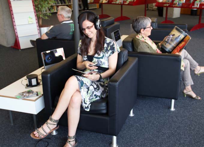 Hier können Sie nach Herzenslust Musik hören, entspannen, Zeitschriften lesen und recherchieren. Nutzen Sie die einladende Sitzlandschaft mit Abhörstationen für die CDs Ihrer Wahl oder den Sonic-Chair mit fest installiertem iPad für Premium-Musikgenuss ("sit inside sound"). Natürlich gibt es auch hier, wie in der gesamten Zentralbibliothek, unser kostenloses W-LAN für Ihre eigenen Mobilgeräte.