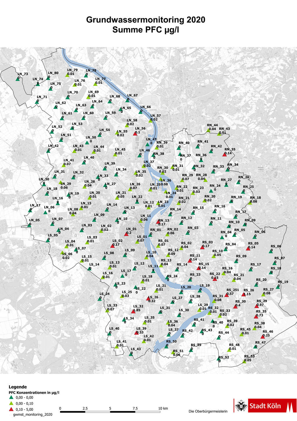 Das Umwelt- und Verbraucherschutzamt überwacht regelmäßig das Grundwasser des gesamten Kölner Stadtgebiets mittels eines mehrere Hundert Messstellen umfassenden Netzes. Seit 2010 werden auch die PFC im Grundwasser im gesamten Stadtgebiet analysiert. Die Ergebnisse des jährlichen Grundwassermonitorings aus dem Jahr 2020 sind in der nebenstehenden Karte dargestellt. Es ergaben sich Auffälligkeiten, die durch eine schrittweise Verdichtung des Messstellenrasters Eintragspunkten zugeordnet werden konnten. Ausgehend von diesen sogenannten Schadstoffquellen haben sich durch die Bewegung des Grundwassers und dem damit verbundenen Transport der PFC kontaminierte, also belastete Bereiche (sogenannte Schadstofffahnen), gebildet.