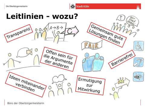 Wir erproben und entwickeln viele neue und moderne Beteiligungsformate, um den Bürger*innen passgerechte Mitwirkungsmöglichkeiten anzubieten, wie zum Beispiel den Bürgerhaushalt oder Ideenschmieden in Stadtentwicklungsgebieten. Sie unterliegen kaum gesetzlichen Vorgaben oder Qualitätsstandards. Damit diese neuen Formen der Bürgerbeteiligung als Bereicherung und Ergänzung zu den demokratisch legitimierten Diskussions- und Entscheidungsprozessen wirken können, braucht es allgemein anerkannte "Spielregeln", also ein verbindliches, allgemeingültiges Regelwerk, das bei der Planung, Durchführung und Auswertung aller Beteiligungsverfahren in Köln gilt.