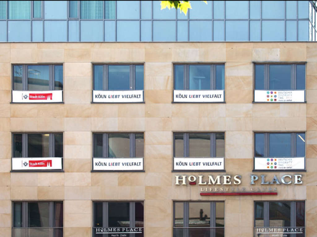 Unter dem Motto "Vielfalt unternehmen: Wir zeigen Flagge!" wurde die Fensterfront unseres Dienstgebäudes gegenüber dem Gürzenich zur "Werbebotschafterin für Vielfalt".
