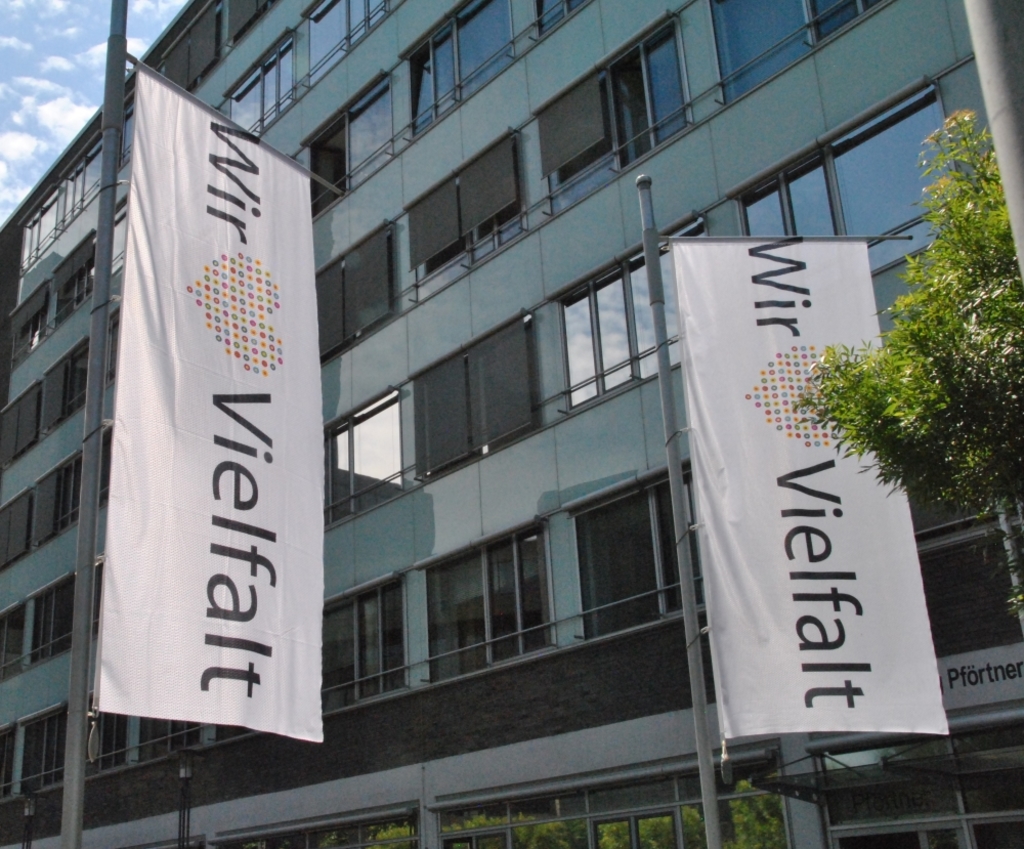 Die Flaggen mit der Aufschrift "Wir lieben Vielfalt" stehen für Zusammenhalt und einen wertschätzenden Umgang am Arbeitsplatz, unabhängig von Herkunft, Nationalität, Religion, Weltanschauung, körperlichen und geistigen Fähigkeiten, Alter sowie sexueller und geschlechtlicher Identität.