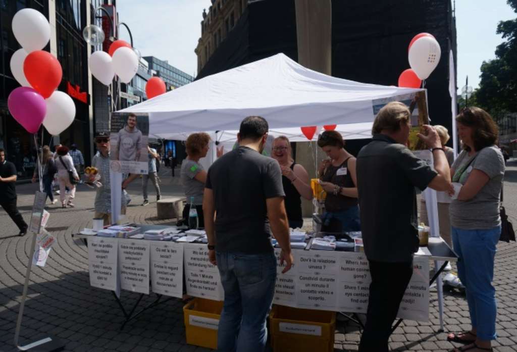 Zusätzlich luden die Aktionskünstler des Eventtheaters Caracho an beiden Standorten Passanten zu Gesprächen über das Thema Vielfalt ein. Darüber hinaus initiierten die Künstler die Aktion "Eye Contact" und machten damit das Thema Diversity hautnah erlebbar. Hierbei blicken sich zwei fremde Menschen eine Minute lang gegenseitig in die Augen ohne zu sprechen und entdecken hierzu neue Erfahrungen und Gefühle im direkten Augenkontakt mit einem Fremden.