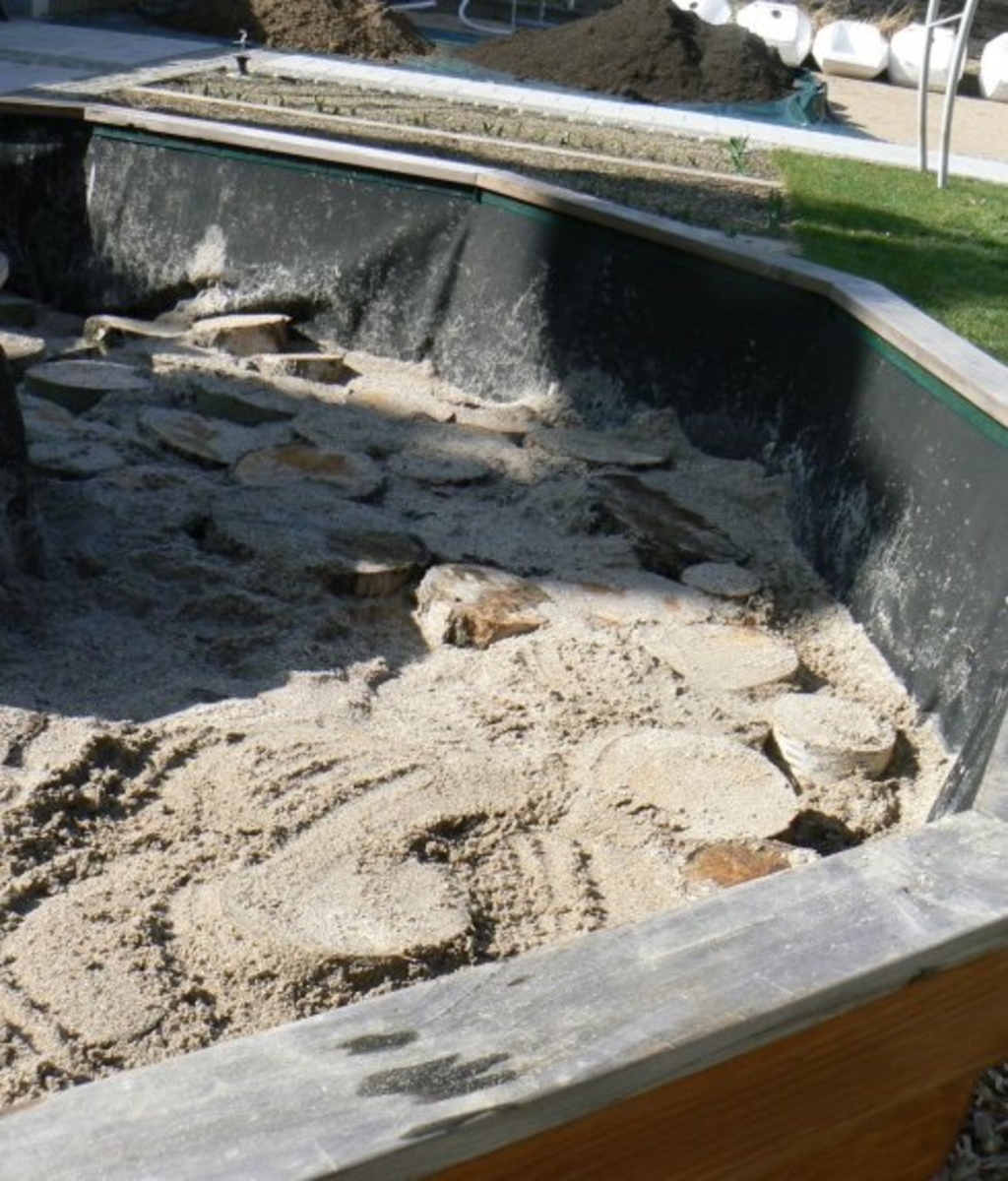 Die Drainageschicht besteht aus dicht gepackten Stammstücken einer langsam verrottenden Baumart, beispielsweise Eiche, zwischen die Sand eingeschlämmt wird. So besteht über das Holz eine lebendige Verbindung zum Boden, die Stammstücke sind aber sehr lange Zeit stabil und verrotten nur sehr langsam. Es gibt Erfahrungsberichte von Hochbeeten, die so aufgebaut wurden und noch nach 20 Jahren keine nennenswerte Sackung aufweisen.