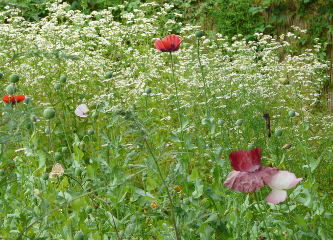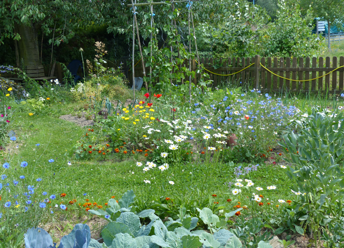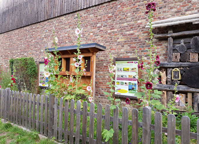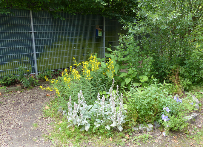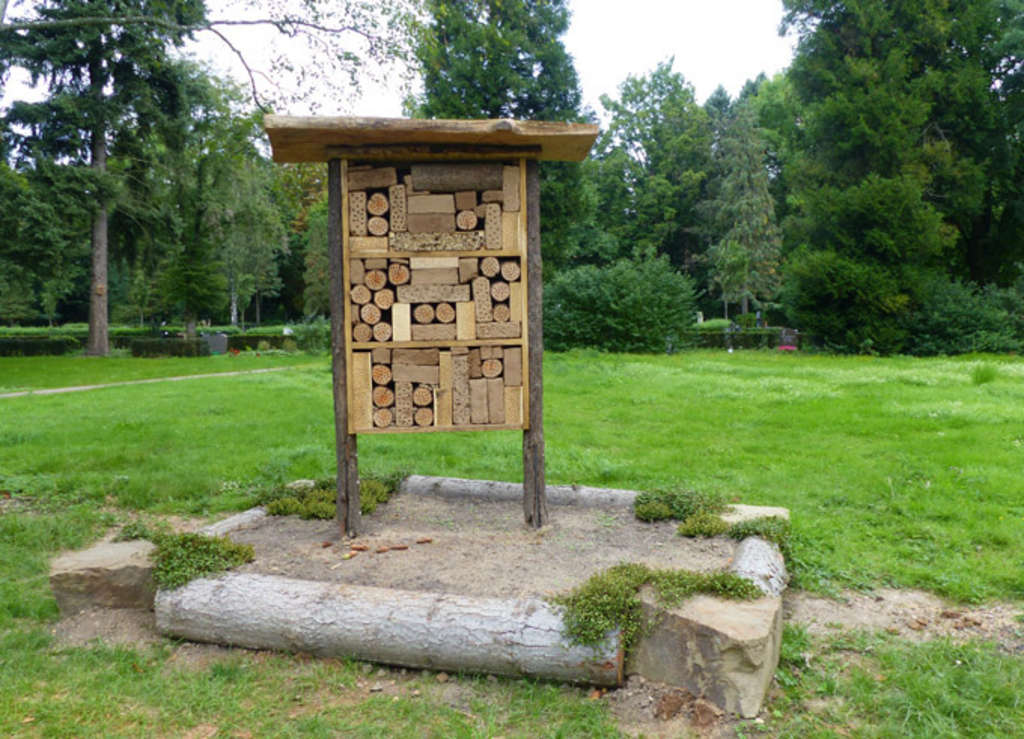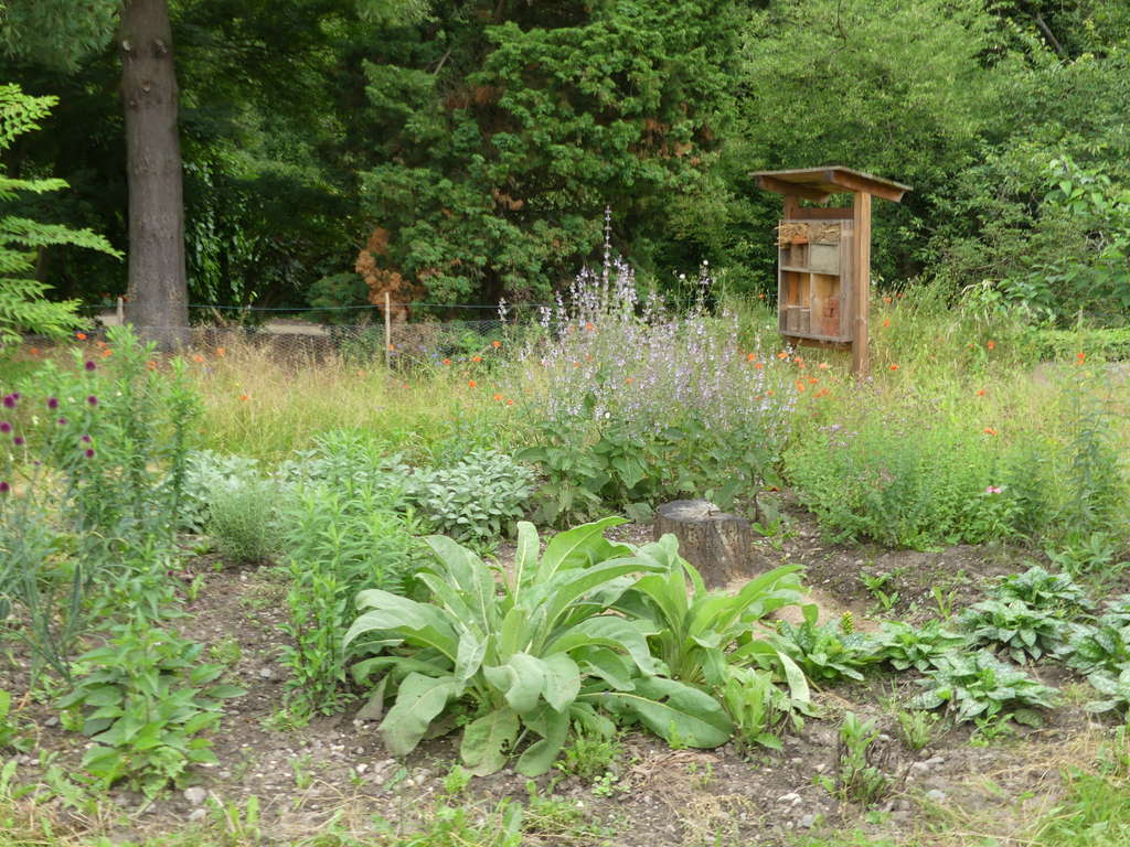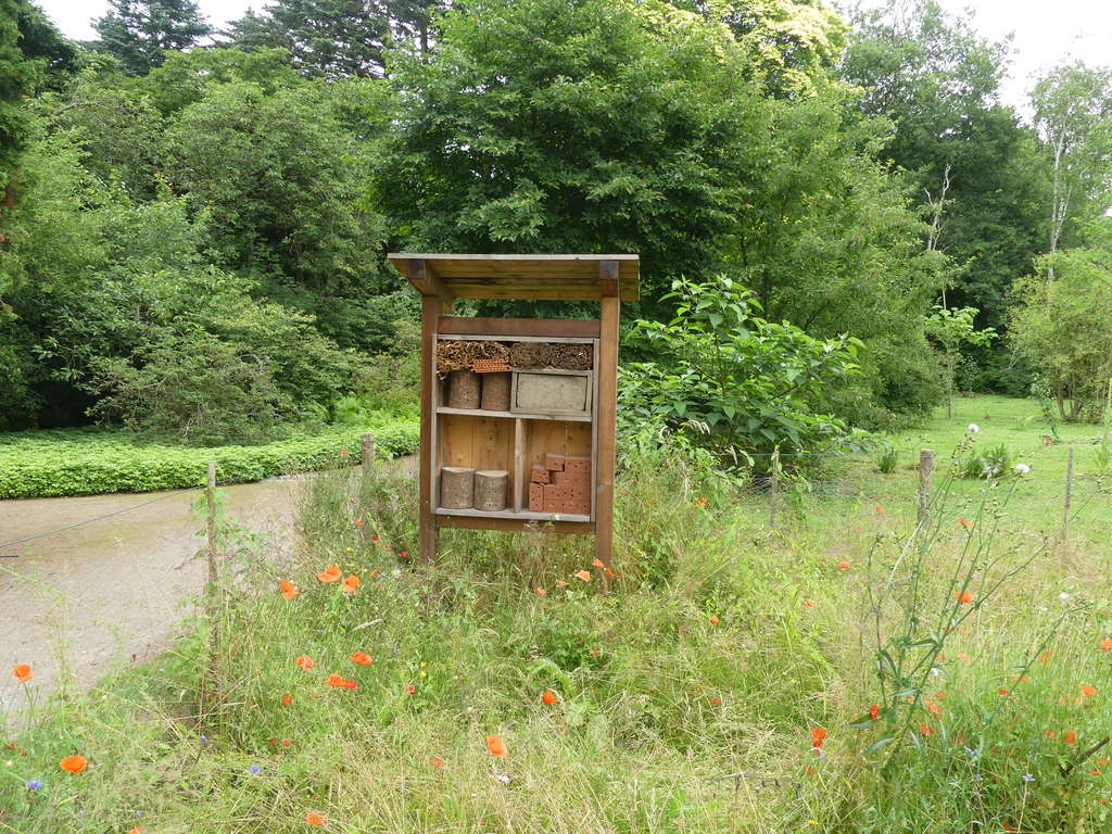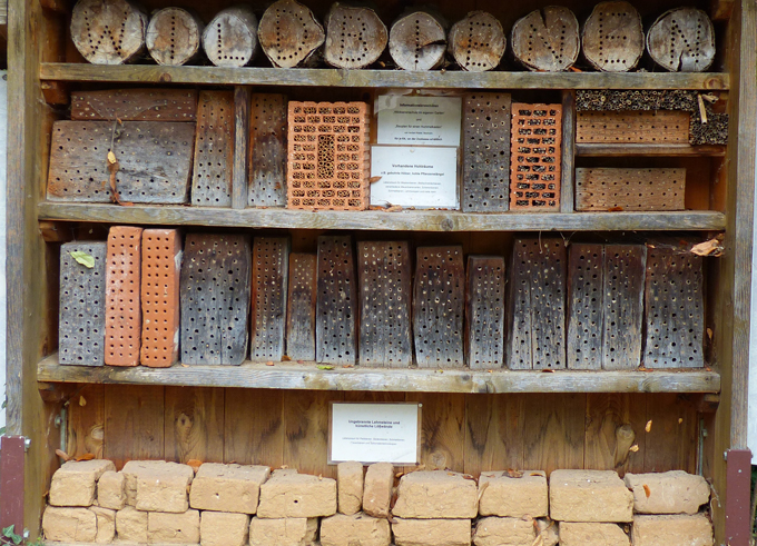 Aber auch im übrigen Zoogelände findet man inzwischen vermehrt heimische Blumen. Noch sind die zahlreichen Hohlräume in Holz, Bambus und Stein nicht bewohnt.
