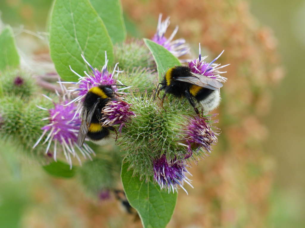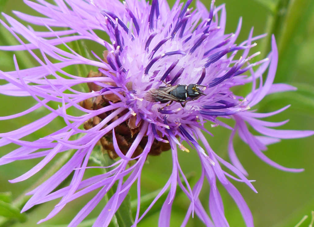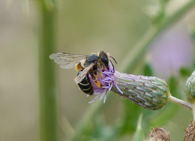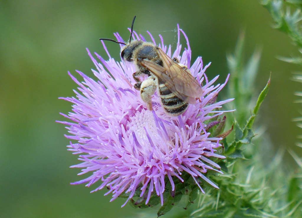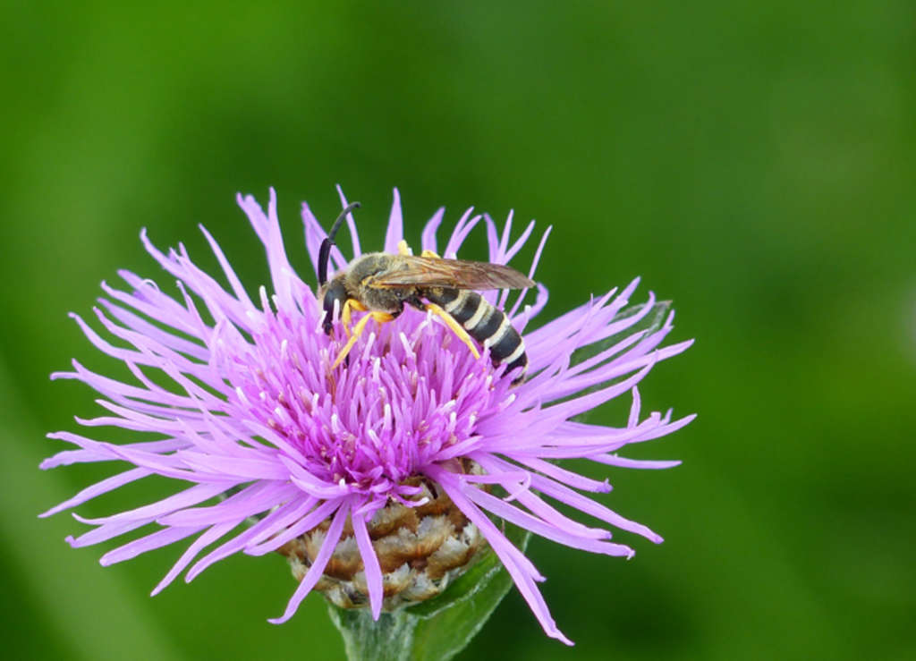 Übrigens: Die sechsbindige Furchenbiene ist in ihrer langen Flugzeit auf genügend Nahrung angewiesen. Da diese oft durch zu frühe Wiesenmahd nicht mehr vorhanden ist, gehen die Bestände stetig zurück. Wer dieser Art helfen möchte, sollte im eigenen Umfeld durch gezielte Pflanzungen für geeignete Blüten von Frühling bis Herbst achten. Vielleicht lassen sich in bestimmten Bereichen auch Disteln ansiedeln.