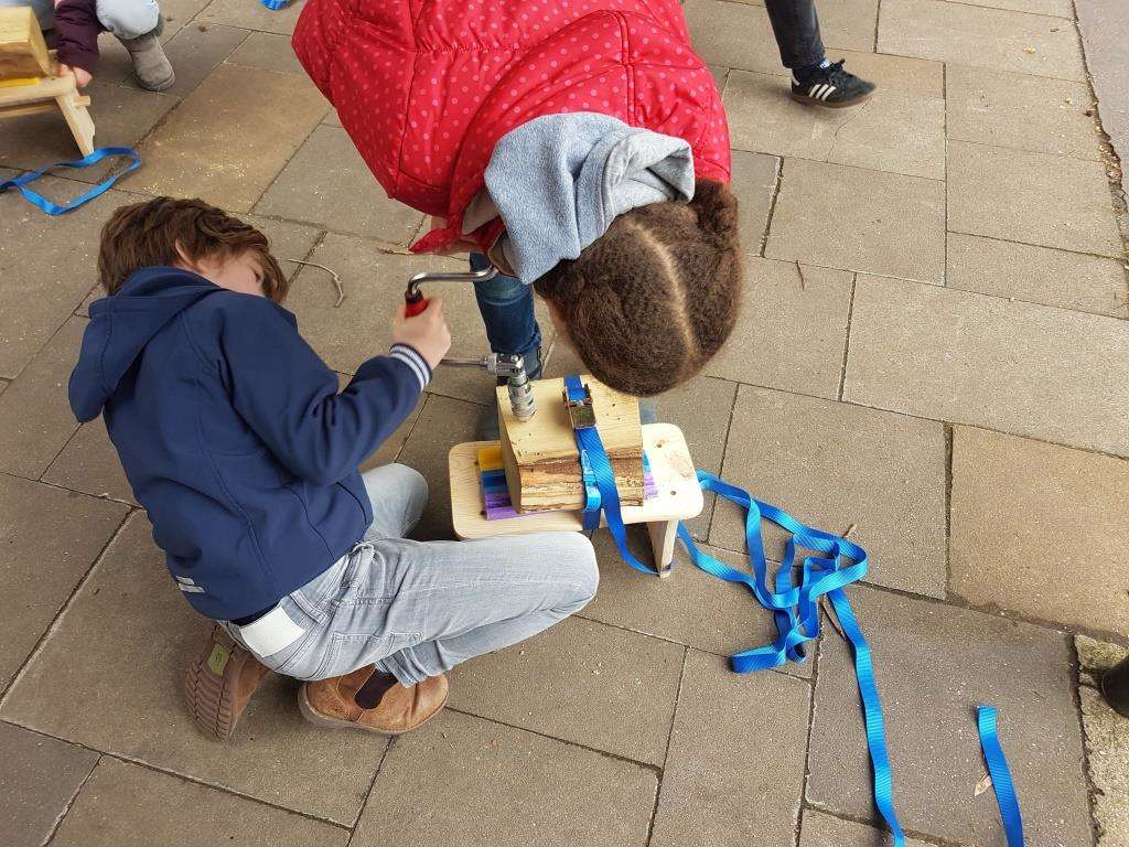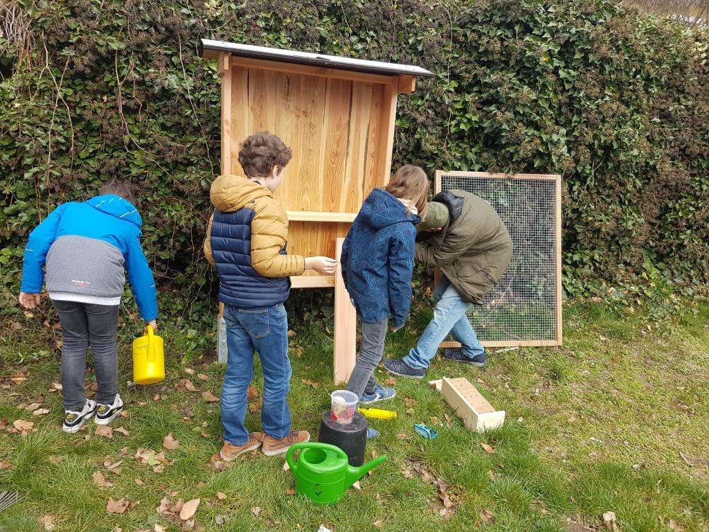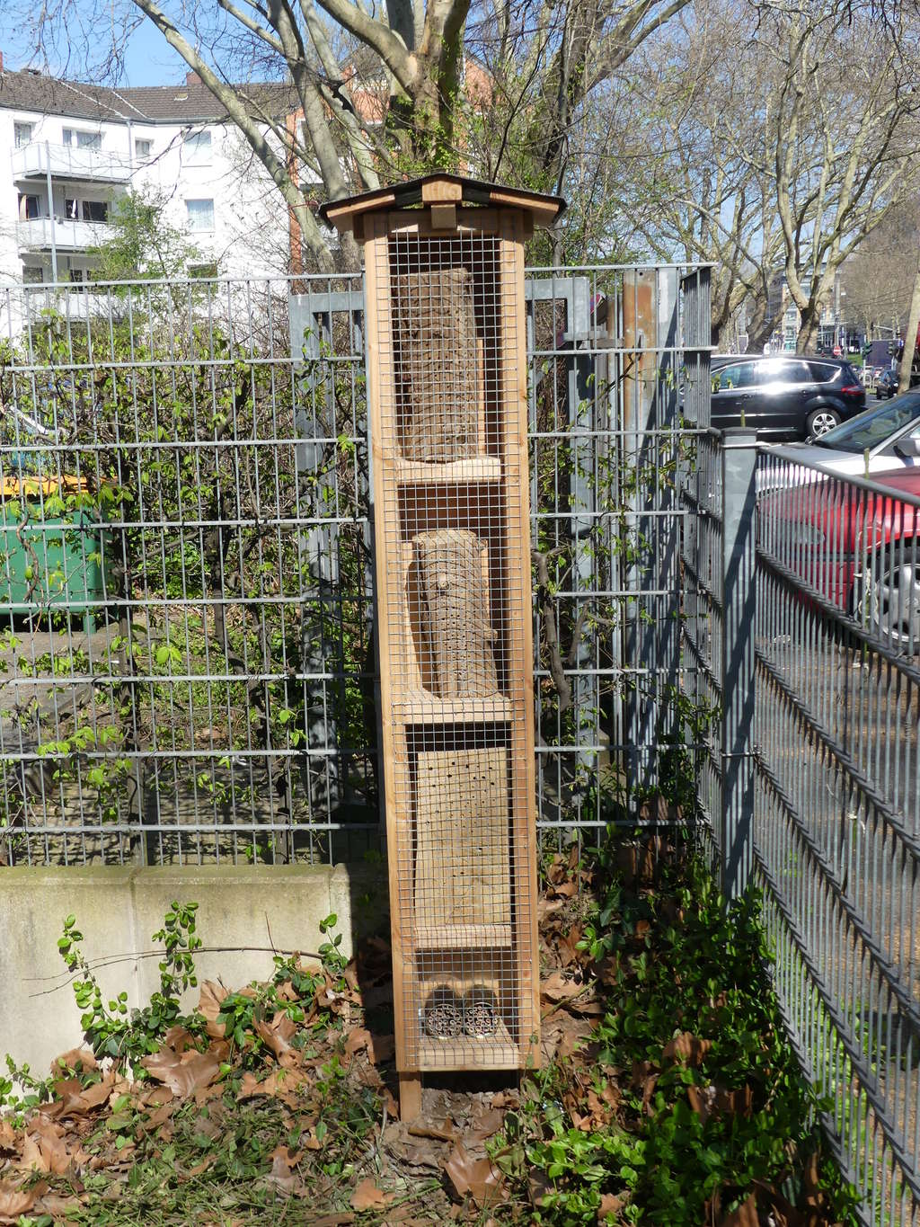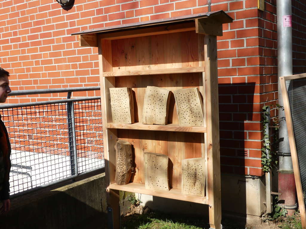 Im Rahmen des Schulgartenwettbewerbs 2017 der Messe Köln unter dem Motto "Wer baut das beste Insektenhotel" machte sich die Offene Ganztagsschule ans Werk, ein solches zu kreieren. Dabei wurde nicht nur die Gestaltung mit viel Einfallsreichtum vorgenommen, es wurden auch alle fachlichen Anforderungen berücksichtigt. Dazu gehörte nicht nur die Ausgestaltung der Nisthilfe, sondern auch die Anpflanzung von Nahrung in Form einer blütenreichen Staudenflur. Immerhin konnte mit der Arbeit der zweite Platz errungen werden. Mit Unterstützung des Umwelt- und Verbraucherschutzamtes wurde anschließend das Nahrungsangebot noch um einen Wildwiesenbereich ergänzt.