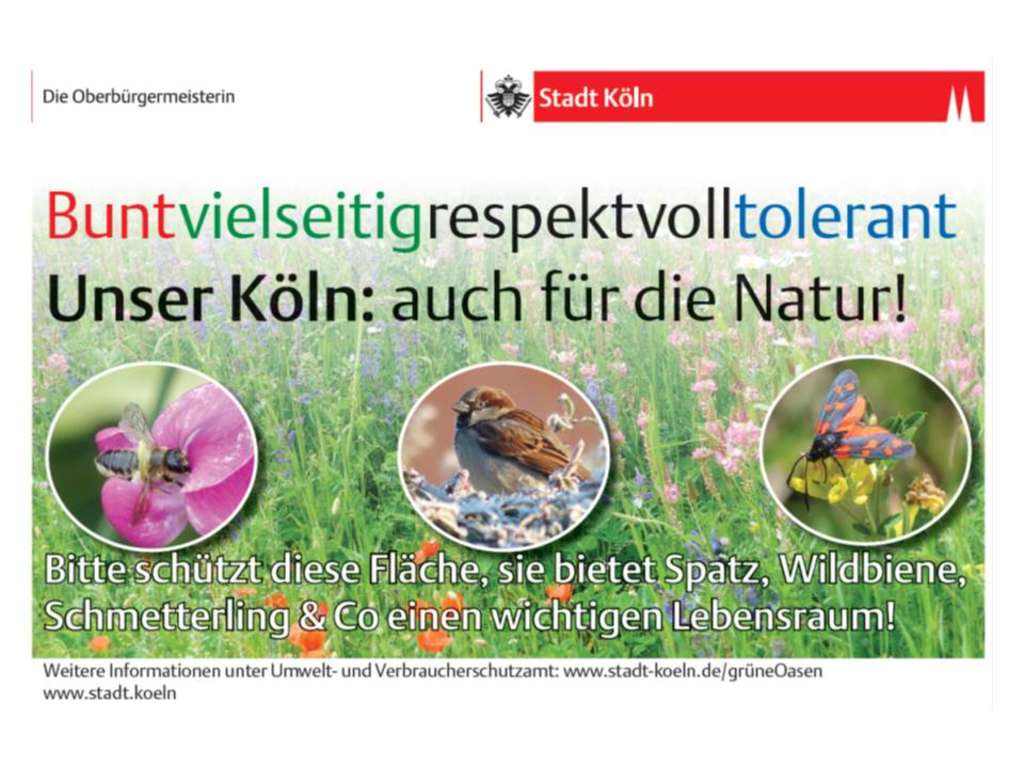 Wie man ohne eigenen Garten Wildbienenschutz betreiben kann, zeigt sich an der Gustav-Cords-Straße inKöln-Nippes. Michael Lakermann pflegt hier seit einigen Jahren einen kleinen öffentlichen Grünbereich über eine Grünpatenschaft. Zunächst wurde eine wildbienengerechte Einsaat vorgenommen und seitdem wird die Fläche als blumenreiche Wiese liebevoll gepflegt. Die inzwischen erreichte bunte Vielfalt zeigt den Erfolg dieser Aktion. Um den Hundebesitzerinnen und -besitzern einen Rundgang zu ermöglichen und so die Akzeptanz der Wiese zu erhöhen, wurde ein Streifen Scherrasen im Randbereich belassen. Zusätzlich klärt ein Schild über die Bedeutung dieser Strukturen auf.