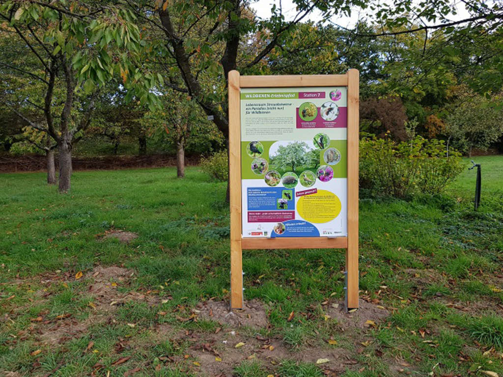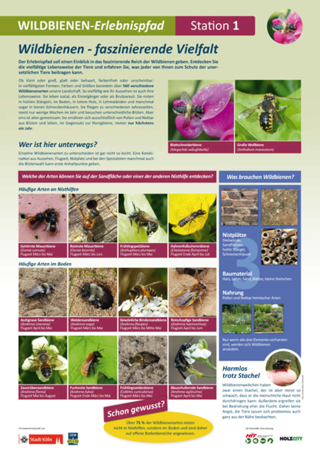 Eine bunte Tafel informiert über die faszinierende Vielfalt der Wildbienen und darüber, wie wichtig ihr Schutz auch für uns Menschen ist.