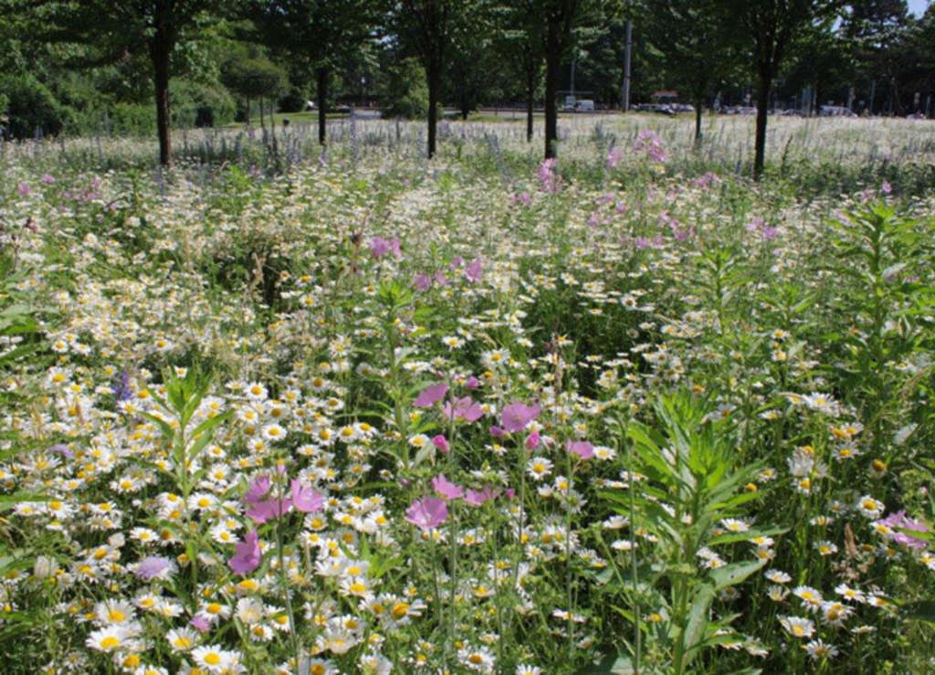 An der Kreuzung Aachener Straße und Innere Kanalstraße hat der NABU Stadtverband Köln anstelle des alten Parkrasens in Zusammenarbeit mit dem Amt für Landschaftspflege 2016 auf 2.500 Quadratmetern eine Wildblumenwiese angelegt. Die Pflege der Wiese erfolgt extensiv und unter ökologischen Gesichtspunkten. Nach einem Jahr hat sich hier bereits ein Meer aus Margeriten, Moschusmalven, Natternkopf und vielen weiteren Wiesenpflanzen entwickelt und ist so zu einem Paradies für Wildbienen, Schmetterlinge und andere Insekten geworden. Eine von uns finanzierte Wildbienennisthilfe sorgt zudem für dringend benötigten Wohnraum für Mauerbienen, Scherenbienen et cetera.