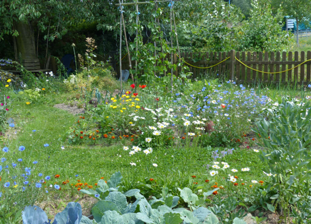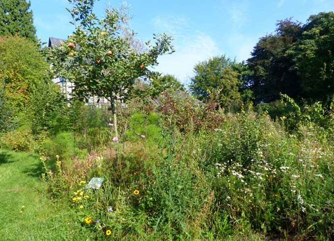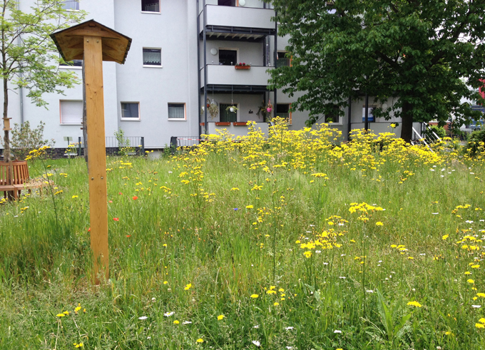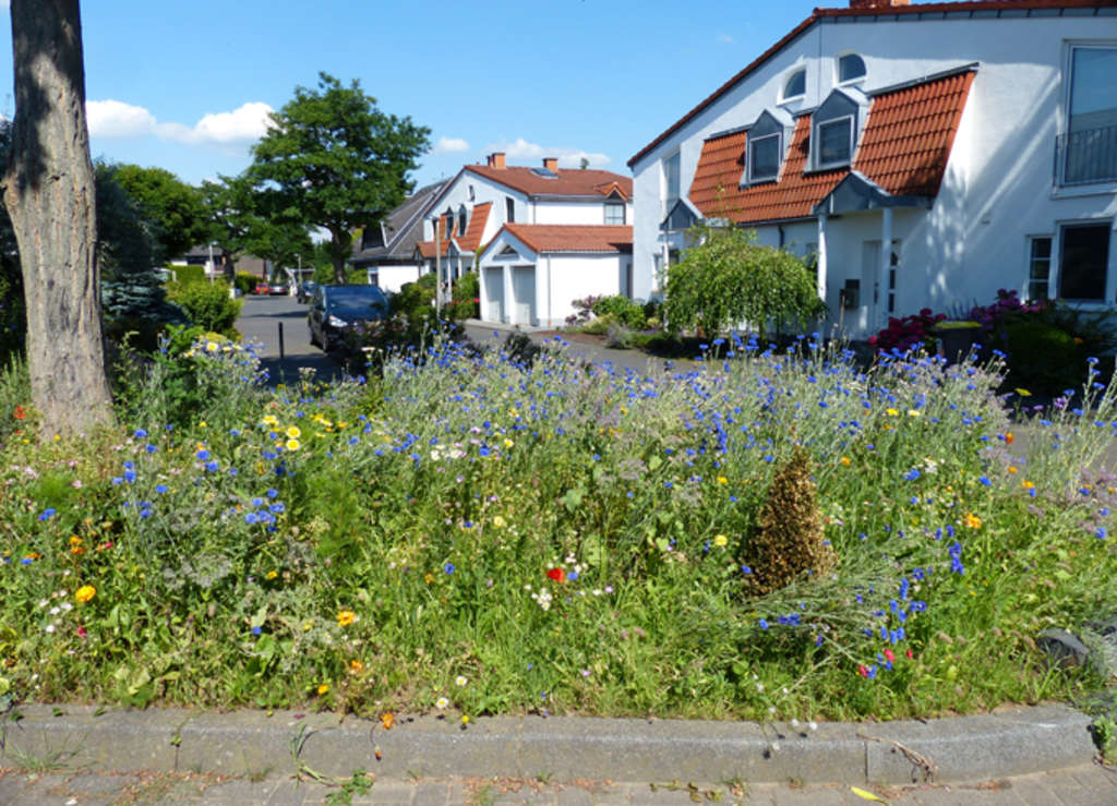 Mit Hilfe einer umfassenden Beratung und tatkräftigen Unterstützung bei der Umsetzung durch den BUND Köln konnte ein Teil der Außenanlagen in der vom Amt für Wohnungswesen betriebenen Wohnanlage an der Kottenforststraße ökologisch hochwertig gestaltet werden. Hierzu gehörten nicht nur das Anpflanzen von Obstgehölzen und das Anlegen von Gemüsebeeten; es wurden auch Zwiebelpflanzen gesetzt und eine 220 Quadratmeter große Wildblumenwiese angelegt. Hier blühen nun unter anderem Malve, Habichtskraut, Gundermann, wilde Karde und Schafgrabe.