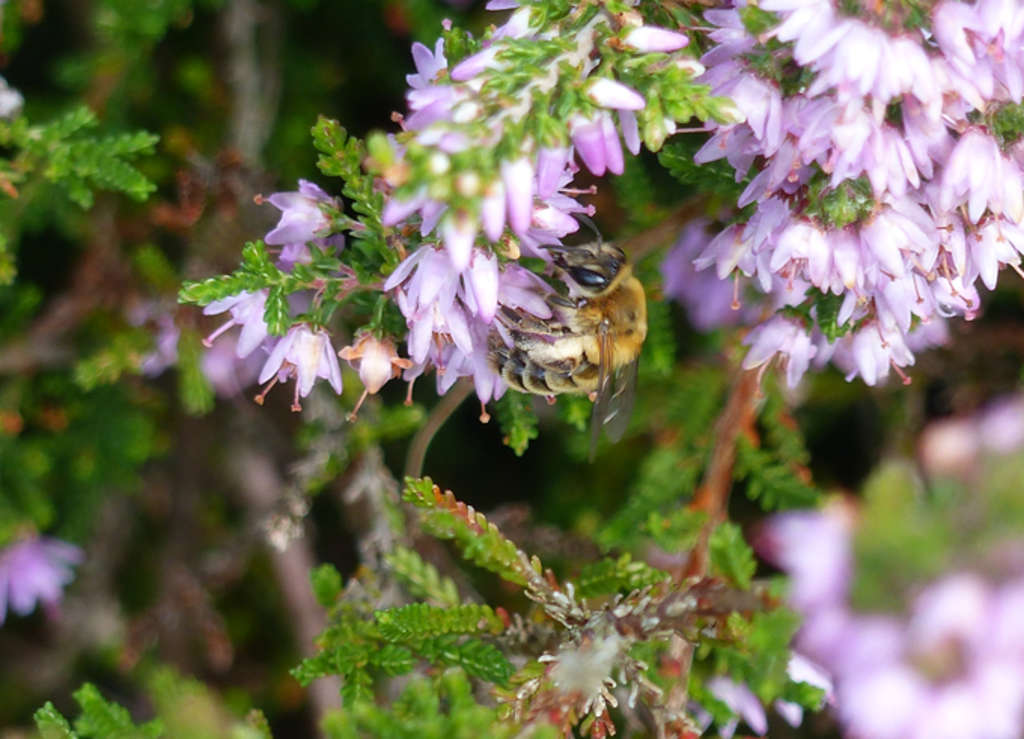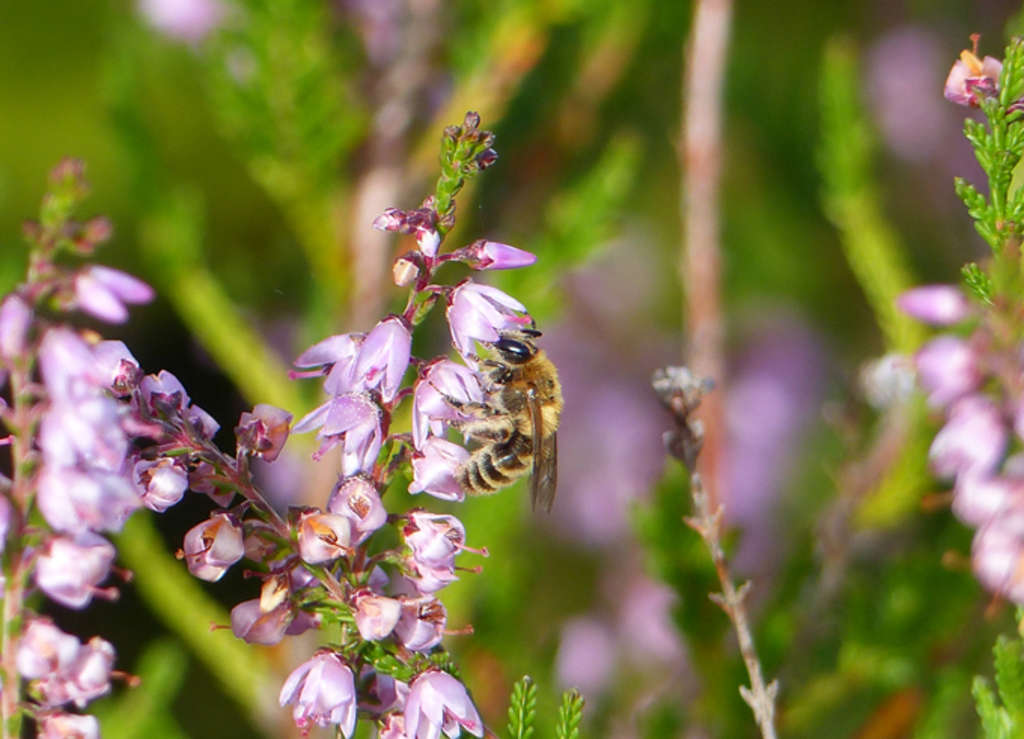 Die eher kleine Sandbiene mit ihrem rotbraunen Pelz am Rumpf, der hellen Bänderung am Hinterleib und den dunklen Beinen tritt als Nachzüglerin erst Ende Juli zur Blüte des Heidekrauts in Erscheinung. Emsig umfliegt sie die frischen Blüten und sammelt eifrig Pollen als Nahrung für den Nachwuchs. Der Pollen wird mit Hilfe der Haarbürsten an den Beinen in ein selbst gegrabenes Erdnest transportiert, darauf wird ein Ei abgelegt und der Gang schließlich mit Erde verschlossen. Nun kann sich die neue Generation im Verborgenen entwickeln, bis sie im nächsten Spätsommer schlüpft und erneut das Heidekraut umschwärmt. Aufgrund der engen Bindung der Heidekrautsandbiene an Pollen und Nektar des Heidekrauts ist es nicht verwunderlich, dass diese Art im Rückgang befindlich ist. Denn infolge von Bebauung oder fehlender Pflege sind größere Heidebestände eher selten.