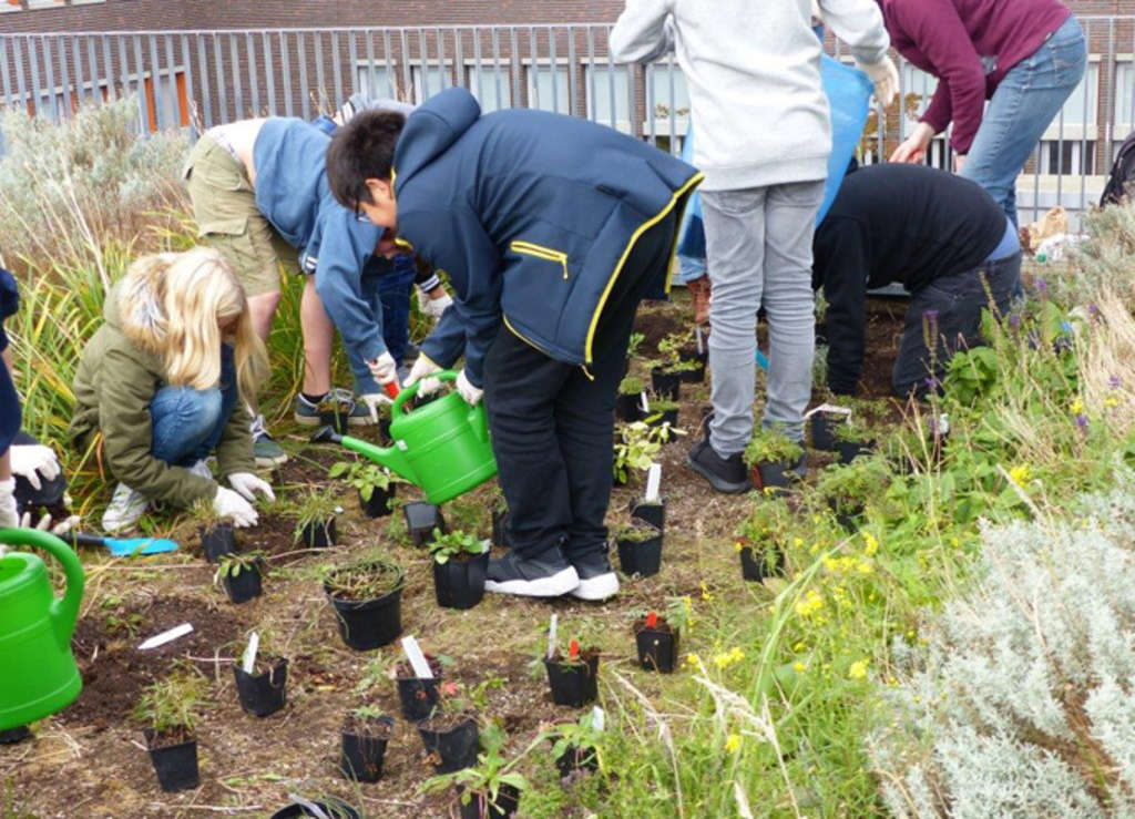 Die Gesamtschule Rodenkirchen ist eine große, bis zu achtzügige Schule. Bei der Planung des modernen Schulgebäudes wurden Flächen für einen Schulgarten nicht vorgesehen. Im Außenbereich befinden sich nur sehr kleine und standörtlich ungünstige Flächen zum Selbstgestalten. Dafür wurde die Schulgarten-AG auf der begrünten Dachterrasse fündig. Die Dachterrasse war bisher mit einer recht artenarmen Mischung verschiedener Stauden und Kleingehölze bepflanzt. Die Schülerinnen und Schüler haben im Herbst 2017 auf einer Fläche von etwa acht Quadratmetern den bisherigen Bewuchs entfernt und eine Mischung aus über 30 verschiedenen Arten gepflanzt.