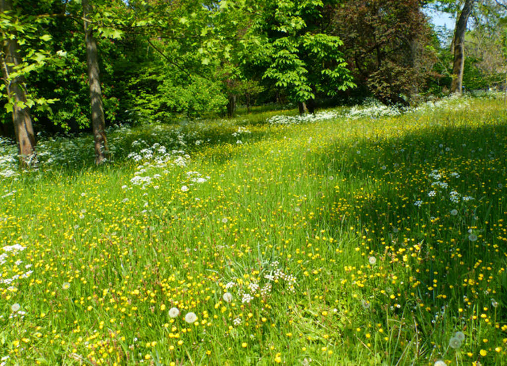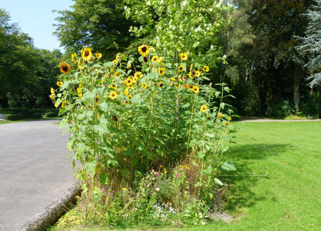 Schon seit einigen Jahren entwickelt das Friedhofsteam in Zusammenarbeit mit dem NABU Köln an verschiedenen, sonnigen Standorten mehrere Wildblumenwiesen. Im Frühjahr erfreuen hier Löwenzahn, Gänseblümchen, Ehrenpreis, Wiesenschaumkraut und Hahnenfuß den Gaumen der Wildbienen. Im Sommer werden diese von Hornklee, Flockenblume, Dost, Habichtskräutern und Pippau abgelöst. Das laute Summen verrät schnell, dass mit dem Aufblühen der ersten Wiesenkräuter eine große Zahl verschiedener Wildbienenarten die Flächen bevölkert. Unter anderem können die Rote und die Gehörnte Mauerbiene, die Frühlingspelzbiene und die Hahnenfußscherenbiene hier gesichtet werden.