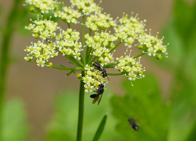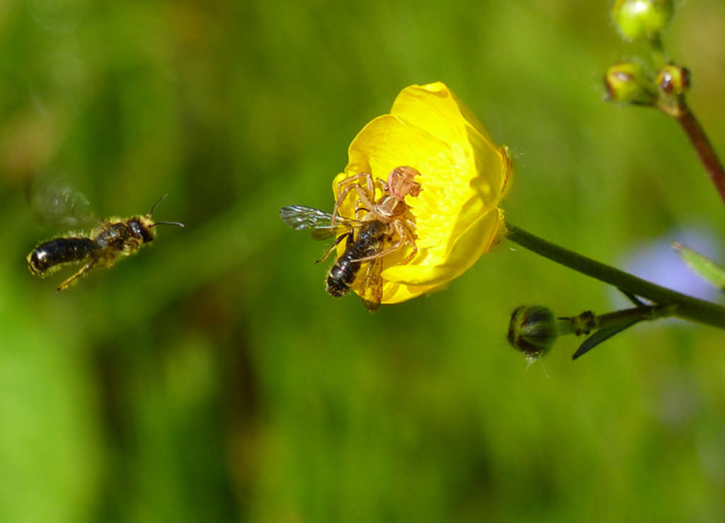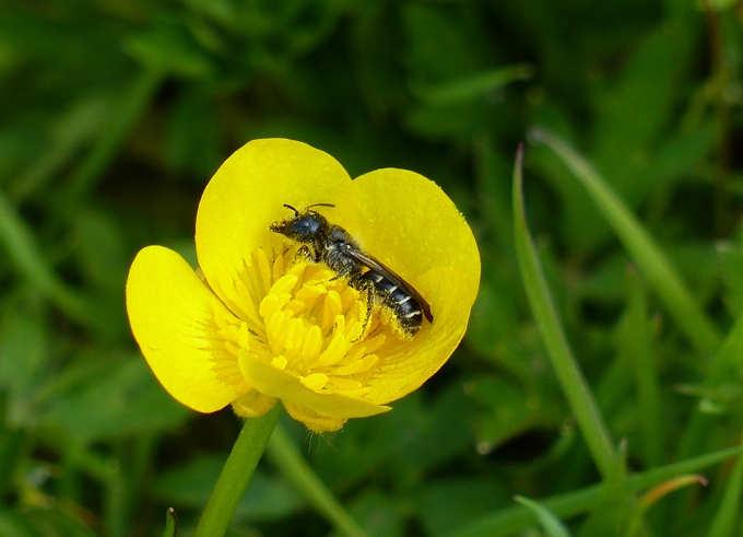 Wenn im Frühling der Hahnenfuß blüht, ist die Zeit der Hahnenfußscherenbiene gekommen. Mit ihren starken Mundwerkzeugen beißt sie sich unter Aufbietung großer Kräfte aus ihrem fest verschlossenen Nistplatz in die Freiheit, um den Pollen und Nektar der einzigen Pflanze zu sammeln, die sie nutzen kann, dem Hahnenfuß. Da sie in Holzgängen nistet, ist sie eine häufige Besucherin der Insektennisthilfen. Die Bauten der Hahnefußscherenbiene kann man hier recht gut an dem Verschluss aus kleinen Steinchen und der schwärzlichen Färbung erkennen. Aufgrund ihrer geringen Größe fällt sie meist nur bei genauerem Hinschauen auf. Für die Krabbenspinnen, einer ihrer größten Feinde, ist sie jedoch, besonders in der Paarungszeit, eine leichte Beute. Will man ihr helfen, sollte man neben dem Aufstellen einer kleinen Nisthilfe vor allem ihre Nahrungspflanze, den Hahnenfuß, im Umfeld dulden, da sie nur von dieser Pflanze leben kann.