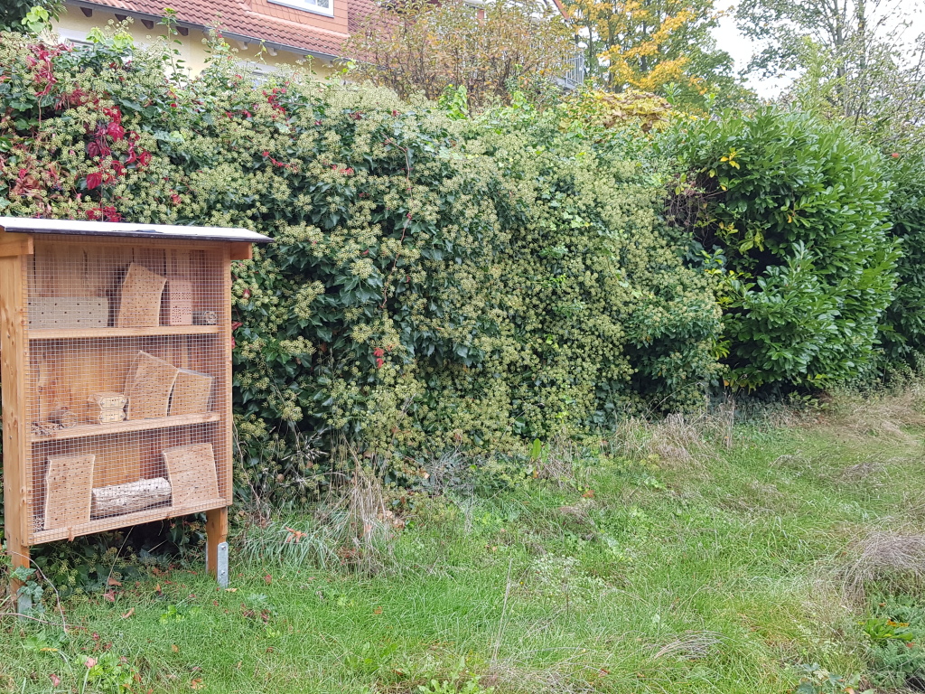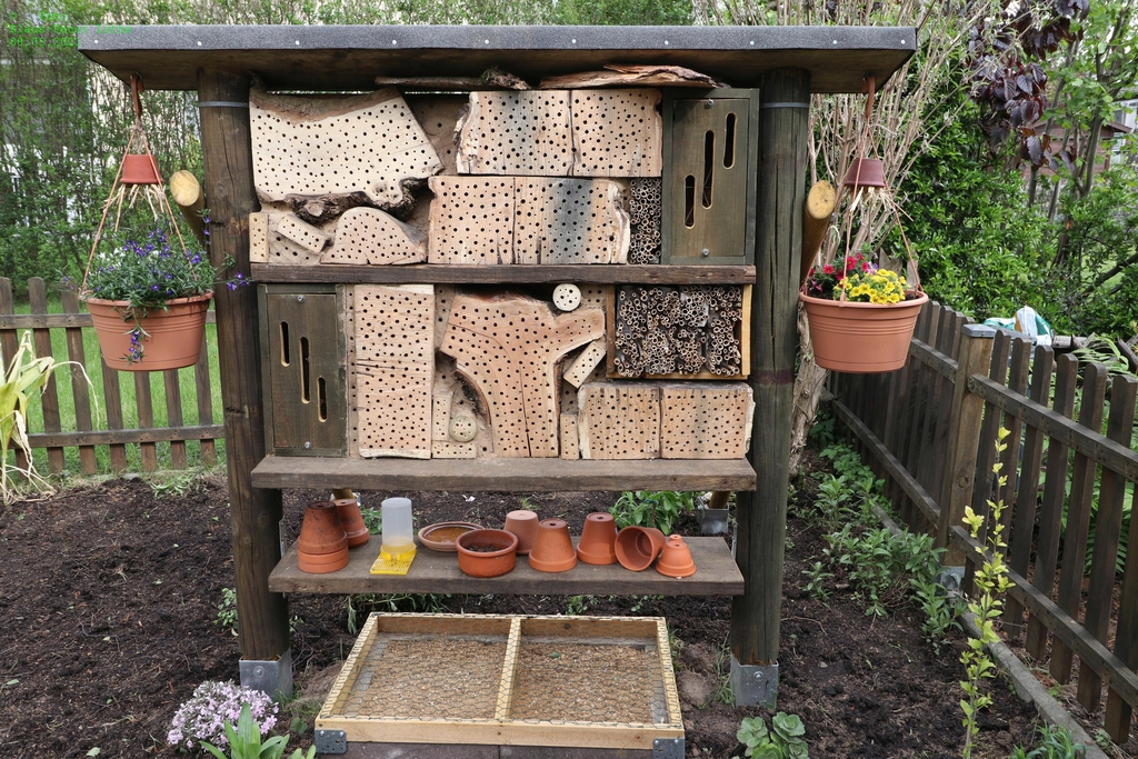 "Unsere kleine Eigentümergemeinschaft hat auf dem Gemeinschaftsgrundstück in Eigenleistung dieses Insektenhotel (mit Sandarium, Insektentränke und einer Schale mit lehmigem Schlamm) errichtet, um sich an dem wichtigen Projekt zu beteiligen.