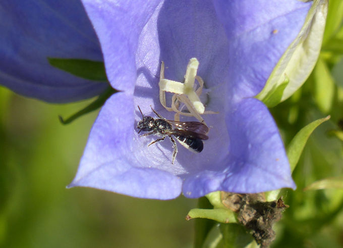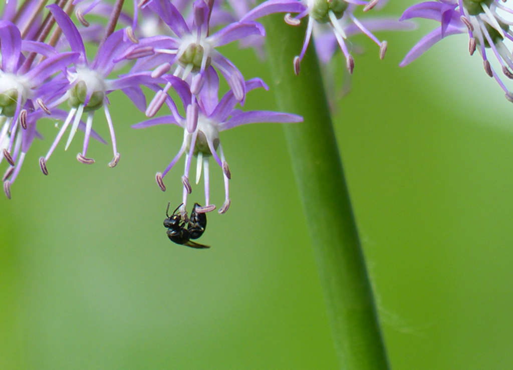 Neben der Frühlingspelzbiene, der Gartenwollbiene und der Roten Mauerbiene kann man gespannt sein, ob hier durch den angrenzenden Gehölzbestand nicht auch die Waldpelzbiene eine Heimat findet. Morsches Holz zum Nisten müsste sie genügend finden und mit dem Einpflanzen von Lippenblütlern wurde auch ihre Nahrungsvorliebe berücksichtigt. Als Totholznutzer konnte bereits die Blauschwarze Holzbiene nachgewiesen werden.