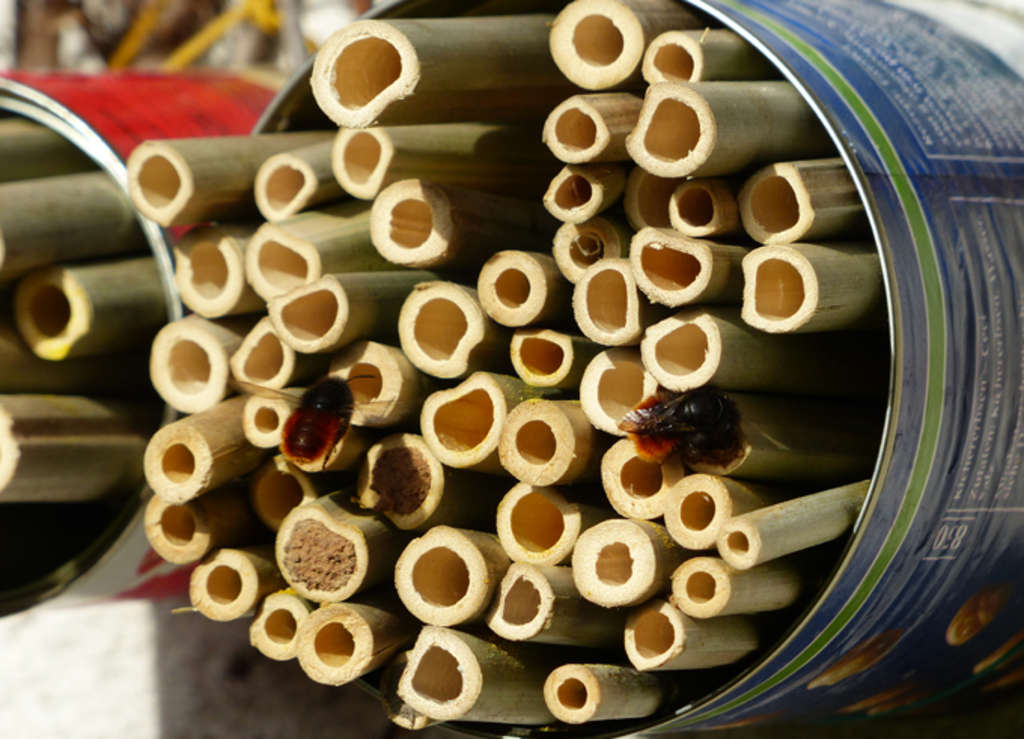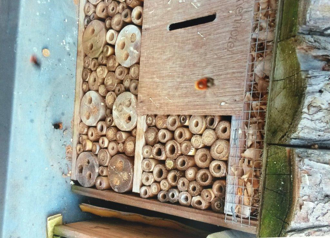 An der Insektennisthilfe zeigt sich bereits der erste Erfolg der bunten Blütenpracht.