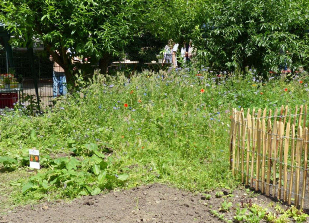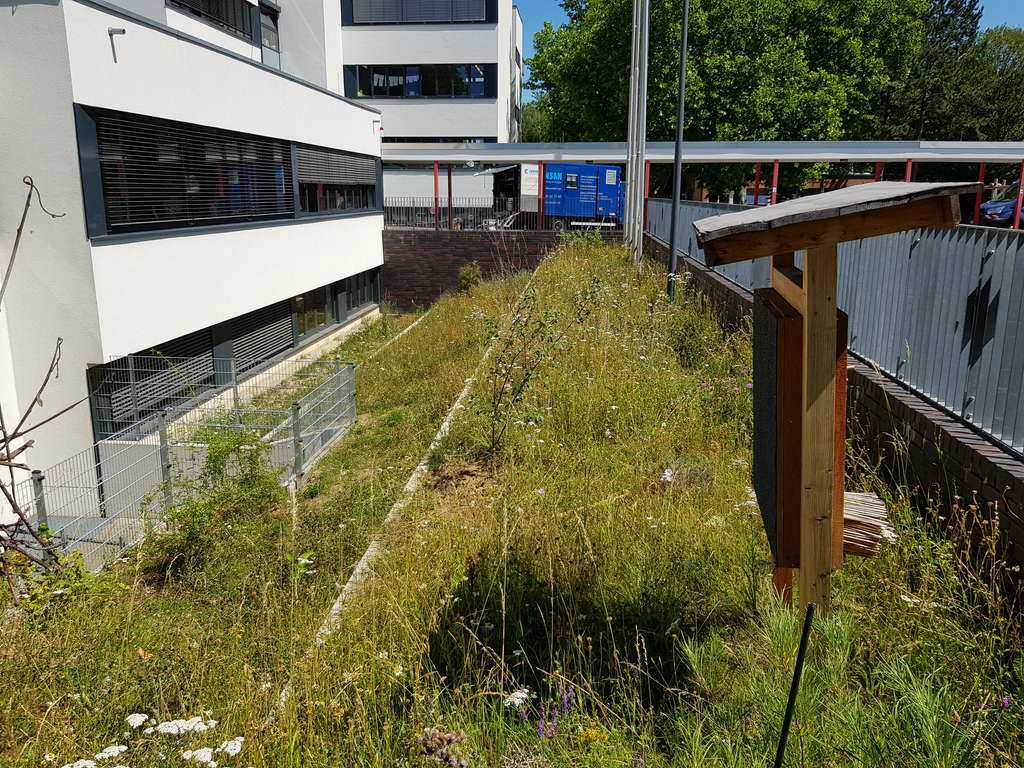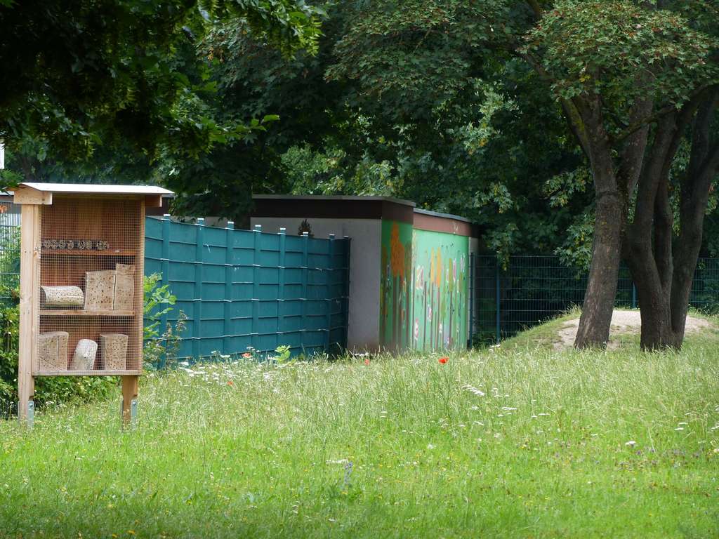 Im vorderen Bereich der Schule wurde eine nicht weiter genutzte Scherrasenfläche von etwa 150 Quadratmetern zu einer Wildwiese umgestaltet. Ein begrünter Zaun und Nisthilfen für Vögel und Wildbienen sollen das ökologische Angebot ergänzen. Der neu gestaltete Bereich ist nicht nur eine Bereicherung für die heimische Tierwelt, er bietet auch den Schülerinnen und Schülern zahlreiche Entdeckungsmöglichkeiten. Nicht nur Wildbienen, auch jede Menge anderer Insekten, wie Käfer, Fliegen und Schmetterlinge lassen sich gut beobachten und erforschen und erschließen spielerisch ökologische Zusammenhänge.