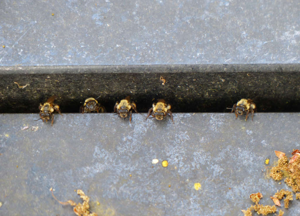 Als Arten konnten inzwischen neben der gehörnten Mauerbiene auch die rote Mauerbiene und einige Maskenbienen auf dem Schulgelände gesichtet werden.