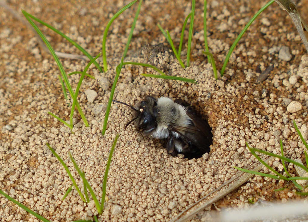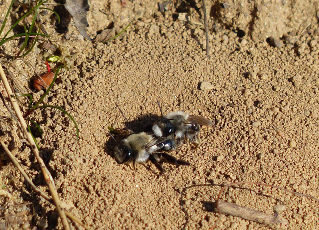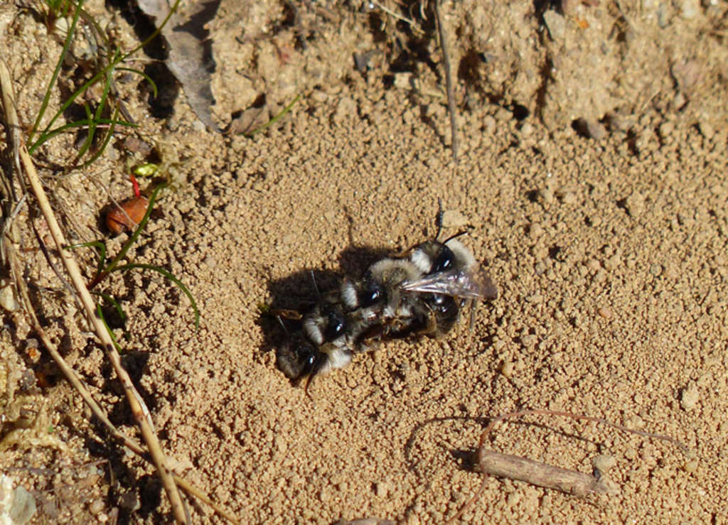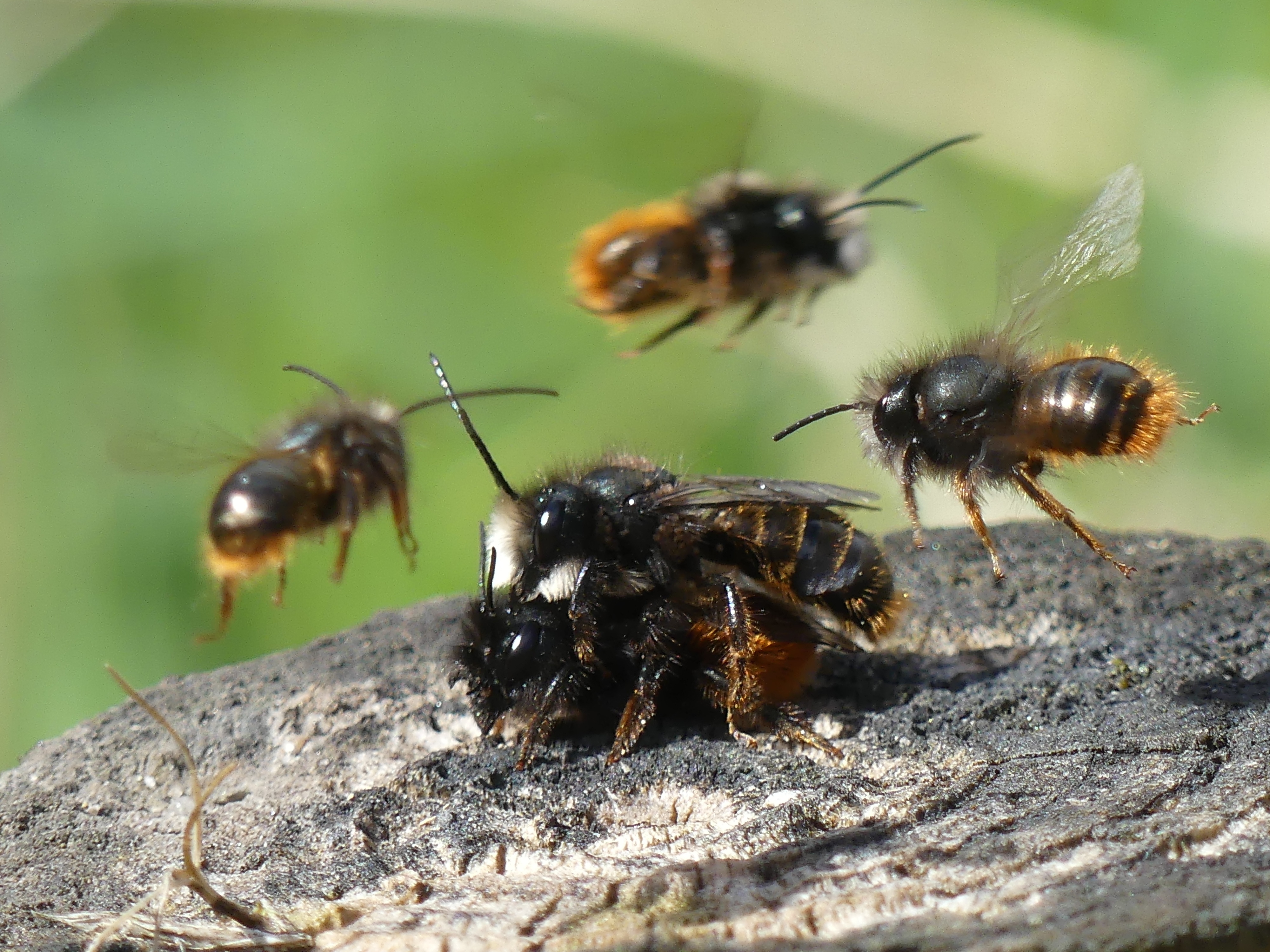 Übrigens: Durch die meist größeren Ansammlungen von Tieren an einem Ort ist Feinden Tür und Tor geöffnet. Und statt gegenseitig die Nistplätze des Nachbarn mit zu bewachen, streiten sie sich um die besten Brutröhren und zerren sich auch schon einmal gegenseitig aus den begehrten Löchern. Gewinner sind Parasiten wie Keulenwespe, Goldwespe oder Trauerschweber.