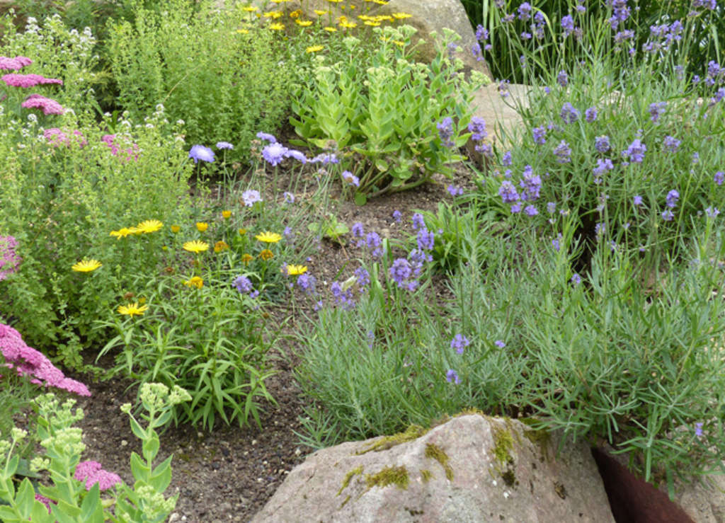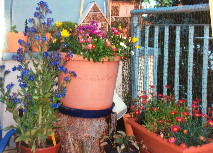 Im Sommer werden die typischen Balkonpflanzen durch Stauden wie Fingerhut, Lavendel und Sonnenblumen ersetzt, um auch die nachfolgenden Wildbienen und Hummeln satt zu machen.