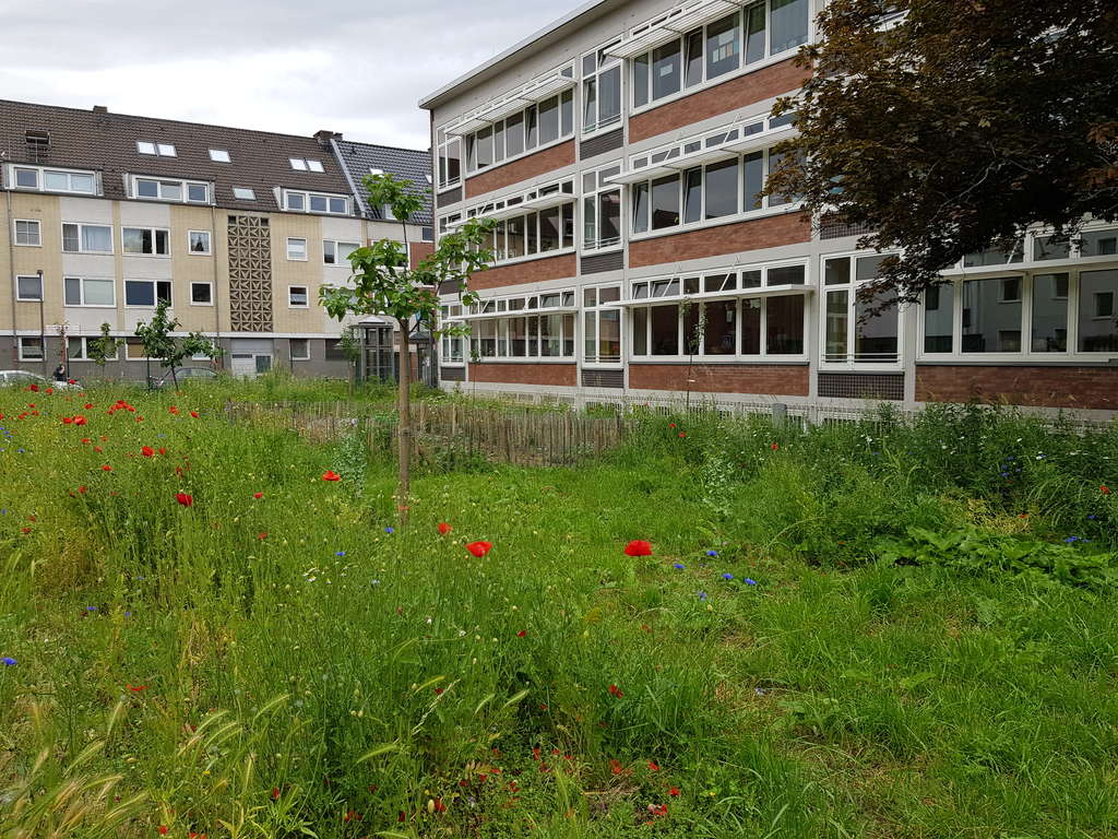Im Kontext des Wildbienenprojektes ist eine besonders schöne Kooperation mit dem Bürgerzentrum Nippes entstanden. Hier wurde auf 150 Quadratmeter eine Wildwiese aus regionalem Saatgut eingesät und zusätzlich Frühblüher gepflanzt.