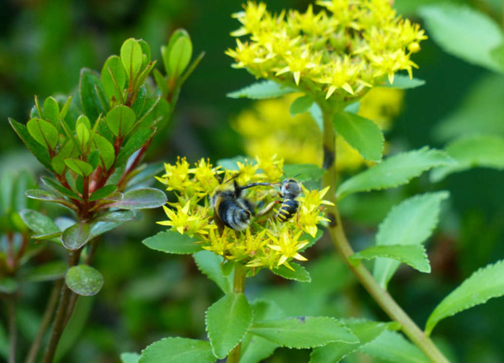 Wildbienen leben rein vegetarisch. Sie nutzen ausschließlich Pollen und Nektar von Blüten. Zur Versorgung eines Nachkommens müssen sie 100 bis 300 geeignete Blüten finden, und zwar in einem Umfeld von nur 100 bis 300 Metern Entfernung vom Nest. Das zeigt wie wichtig für Wildbienen eine blumenreiche Umgebung ist. Heimische Stauden im Garten, auf dem Balkon oder im Park helfen, das notwendige Nahrungsangebot zu verbessern.