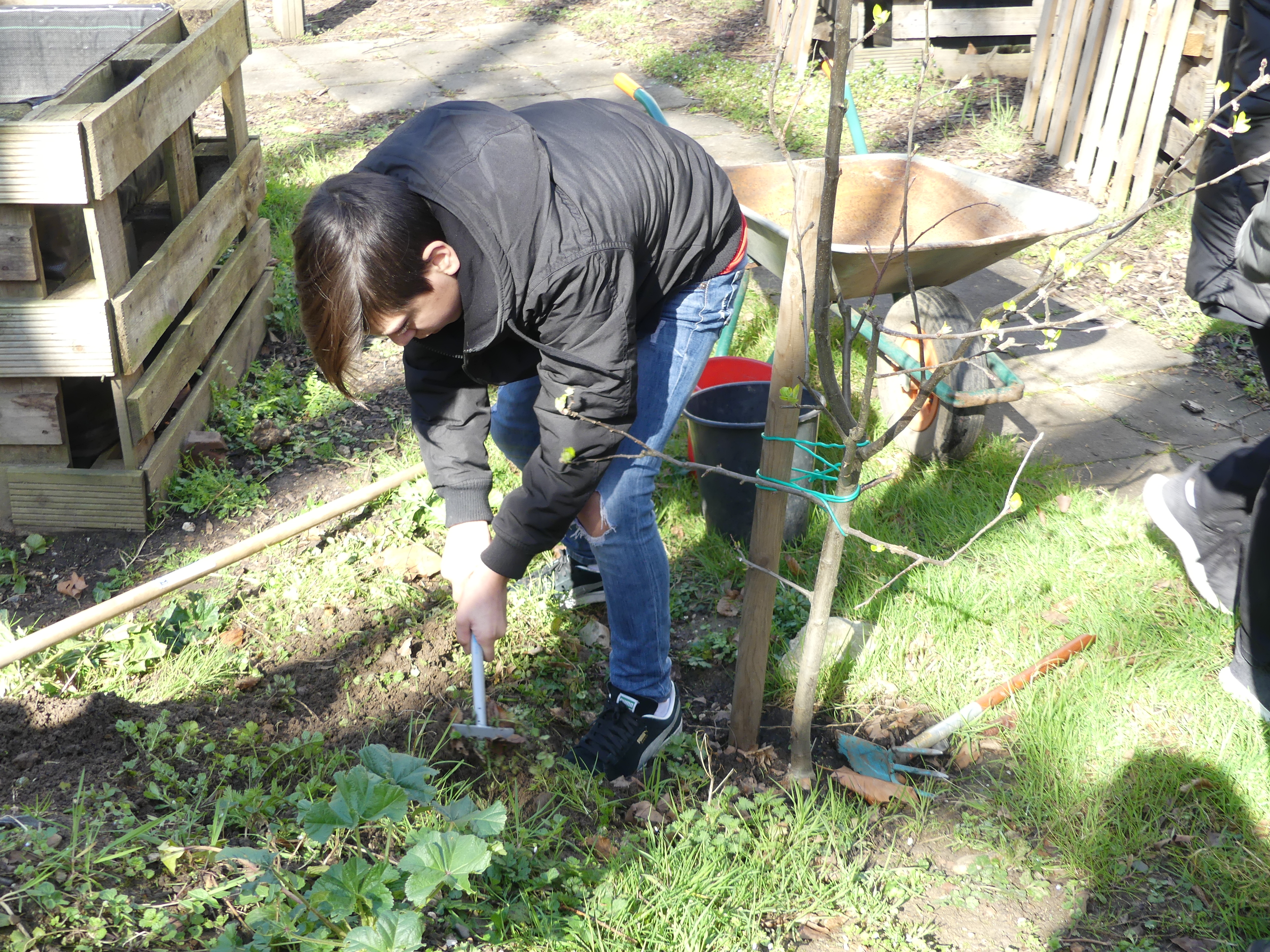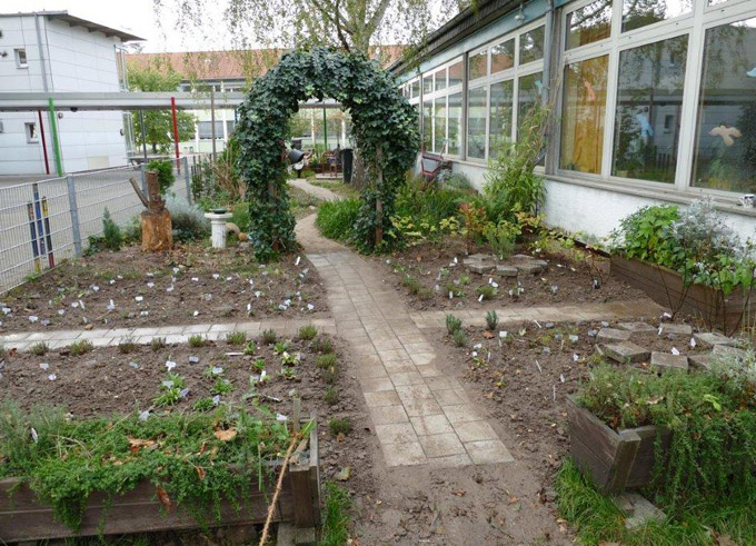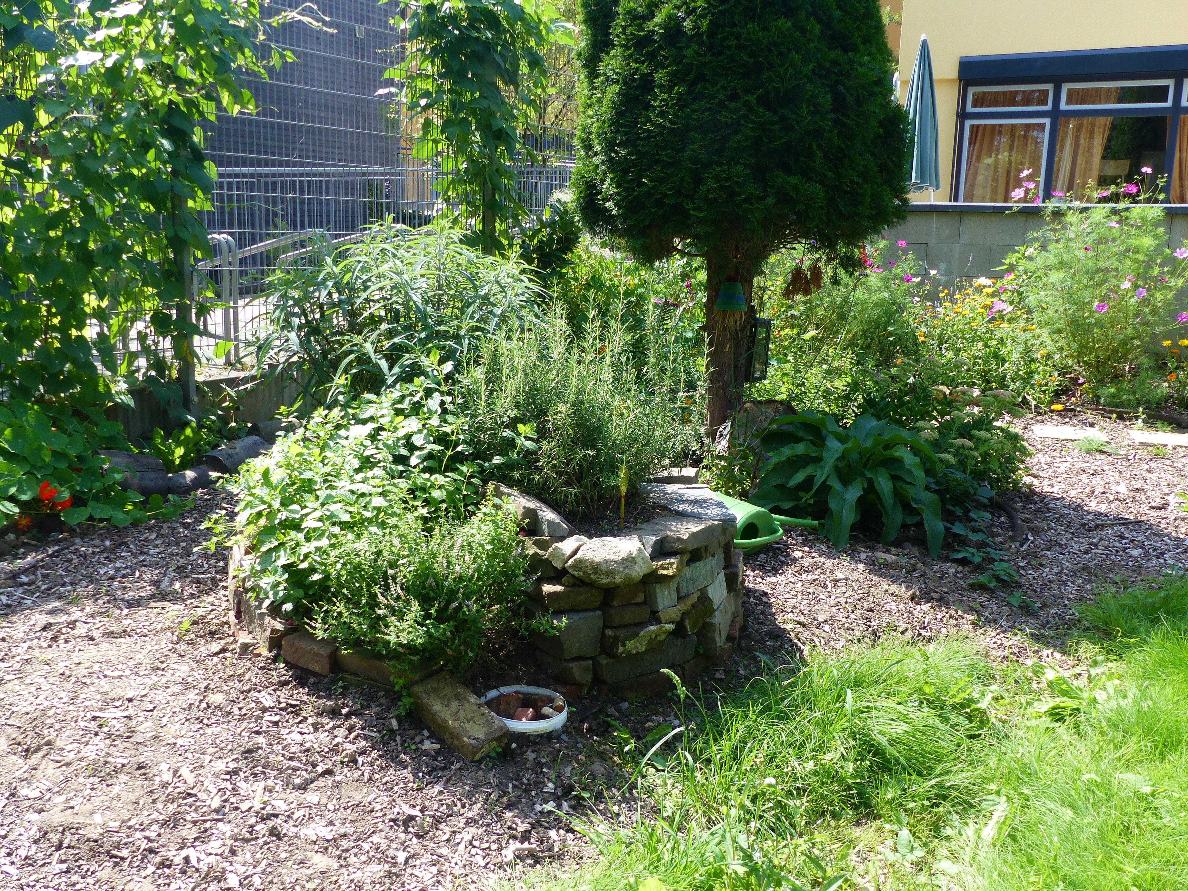 Doch statt einer Buchsbaumhecke haben die Kinder eine Hecke mit vielen verschiedenen blühenden Zwerg- und Halbsträuchern gepflanzt. In den Beeten befinden sich Wildstauden, Kräuter und viele Frühjahrsblüher - insgesamt über 50 verschiedene Arten, so dass von Februar bis November immer etwas blüht. Um das Nahrungsangebot weiter zu ergänzen hat die AG Kirschbäume, Wildrosen und Weiden heimische Bäume gepflanzt, die für Wildbienen besonders interessant sind. Eine Nisthilfe ist auch schon in Planung. So entsteht bald auf dem Schulgelände ein kleines Wildbienen-Paradies.