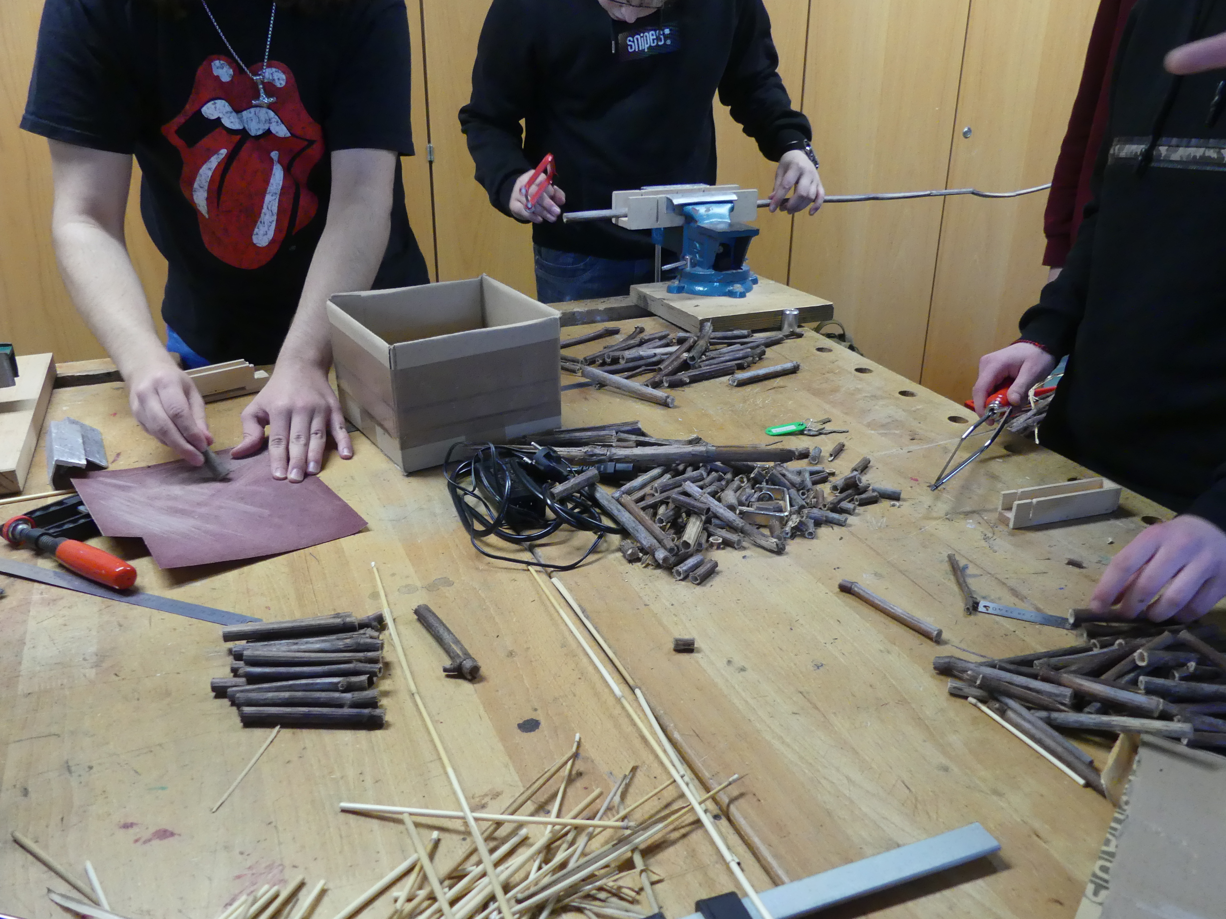 Besonderen Wert haben wir auf Nachhaltigkeit gelegt, und möglichst viel „ausgemustertes“ Baumaterial, wie etwa ausgediente Gerüstbretter, Balken einer kaputten Schaukel, der Stiel eines Spatens, der bei den Arbeiten zu Bruch ging verwendet. Ein altes Stück Baumstamm wurde – mit Genehmigung des zuständigen Revierförsters – aus dem Wald geborgen und bearbeitet, den Sand für das Sandarium bekamen wir freundlicherweise vom Aushub einer Baustelle.