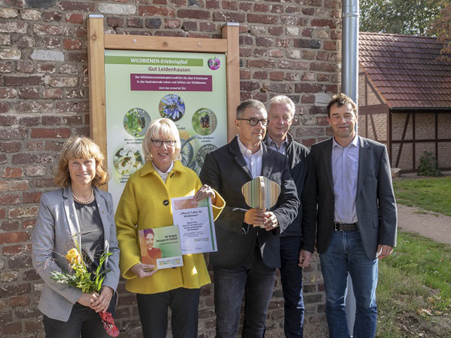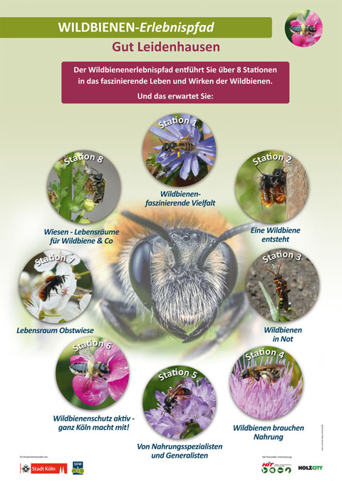 In Zusammenarbeit mit der Schutzgemeinschaft Deutscher Wald Köln ist am neuen Umweltbildungszentrum Gut Leidenhausen in Porz ein Wildbienenerlebnispfad entstanden. Dieser wurde im Oktober 2018 eröffnet und kann jederzeit besucht werden. Acht Stationen informieren die Besucherinnen und Besucher über das spannende Leben der Wildbienen, ihre Gefährdung und mögliche Schutzmaßnahmen. Gezielt wurden spezielle Strukturen für Wildbienen angelegt, wie verschiedene Nisthilfen sowie Kräuter, Stauden und Gehölze. Durch das umfangreiche Angebot an heimischen Pollen und Nektar tragenden Blüten lassen sich viele Arten von Ende Februar bis Ende September unmittelbar erleben.