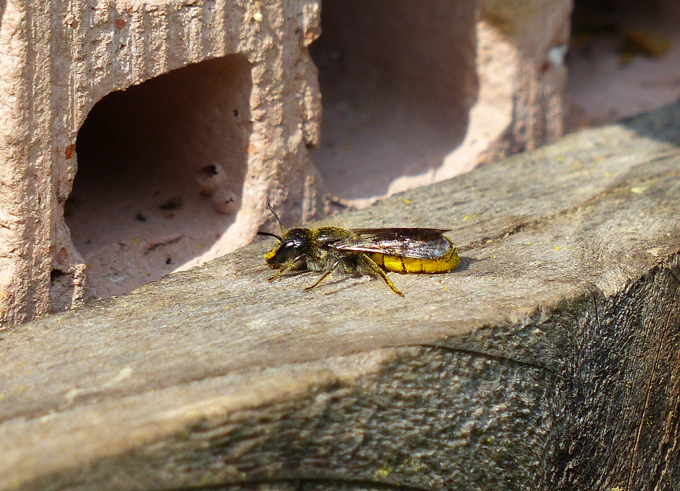 Spätestens, wenn die Blüten der Pflanzen sich öffnen, wird jedoch die eine oder andere Wildbiene die neuen Räumlichkeiten beziehen. Erste Arten, wie die gehörnte Mauerbiene und die Frühlingspelzbiene konnten schon gesichtet werden.