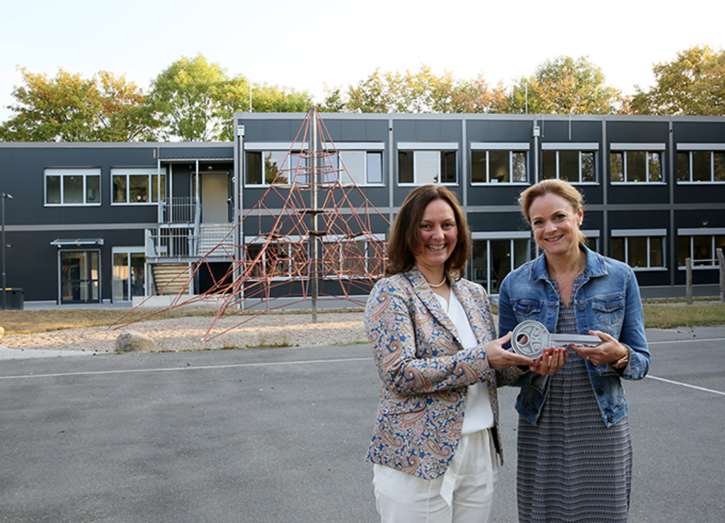 Einen der ersten Modulbauten der jüngsten Generation hatte unsere Abteilungsleiterin für das Objektmanagement, Astrid Schüßler, im August 2018 an Uta Will, Schulleiterin der Katholischen Grundschule Fußfallstraße in Merheim, übergeben. In gleicher Bauart haben wir an der Heßhofstraße in Vingst für die dortige Katholische Grundschule sowie die benachbarte Heinzelmännchen-Schule zusätzliche Gebäude realisiert. In der Nußbaumerstraße in Neuehrenfeld wurde eine Mensa mit Küche für die dortige Gemeinschaftsgrundschule in Modulbauweise errichtet. Darüber hinaus wurde 2018 eine Modulbau-Mensa an die Gesamtschule Dellbrücker Mauspfad übergeben.
