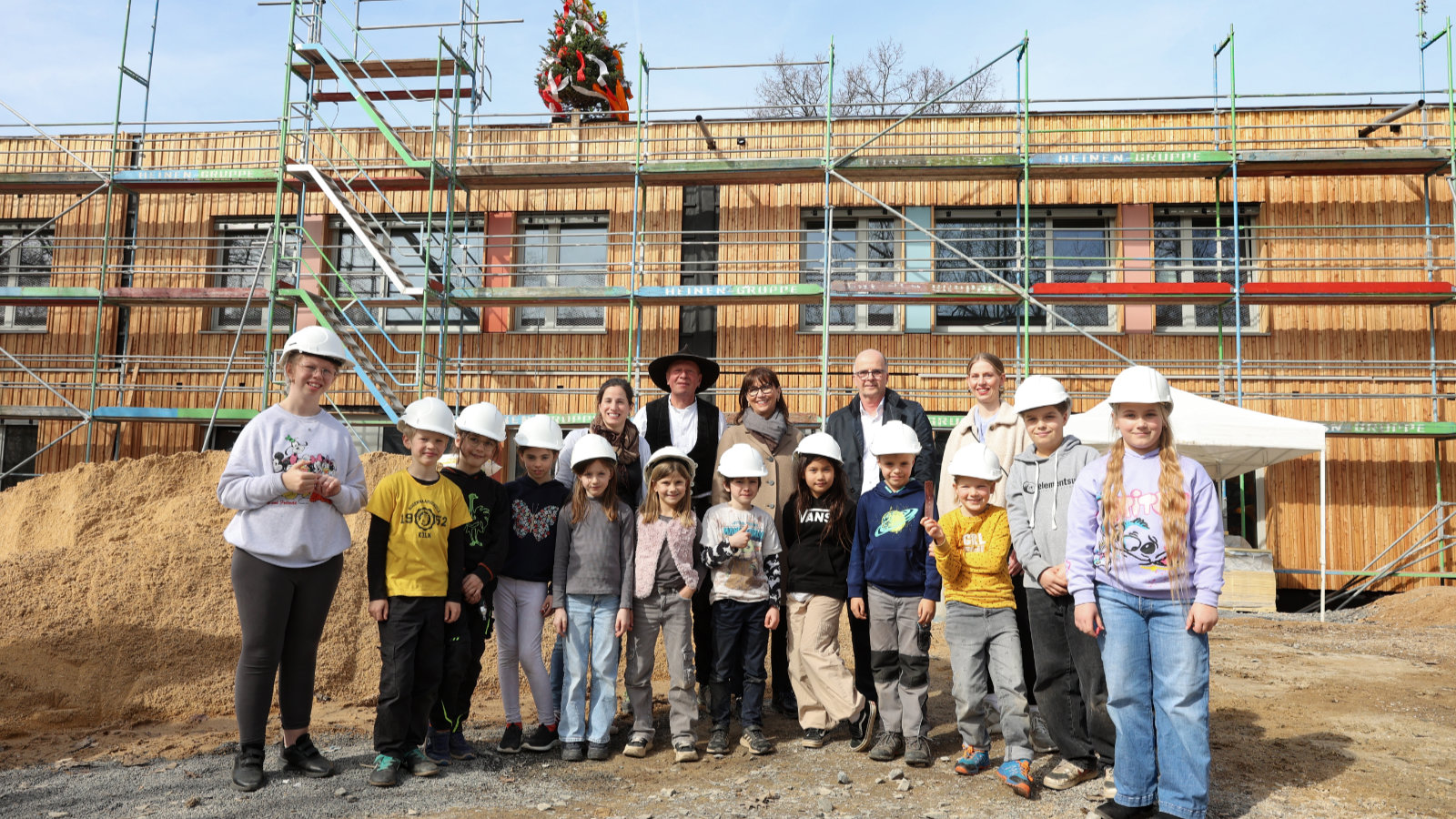 Schon zwei Monate später konnten wir gemeinsam mit der Schulgemeinschaft, Vertreter*innen der Politik und den am Bau Beteiligten das Richtfest feiern und zum Schuljahresbeginn 2025/2026 das Gebäude zur Nutzung an die Schule übergeben. Mit dem Abriss eines Bestandsgebäudes und der Herrichtung einer Sportfläche endet die Gesamtbaumaßnahme am Standort Am Rosenmaar.