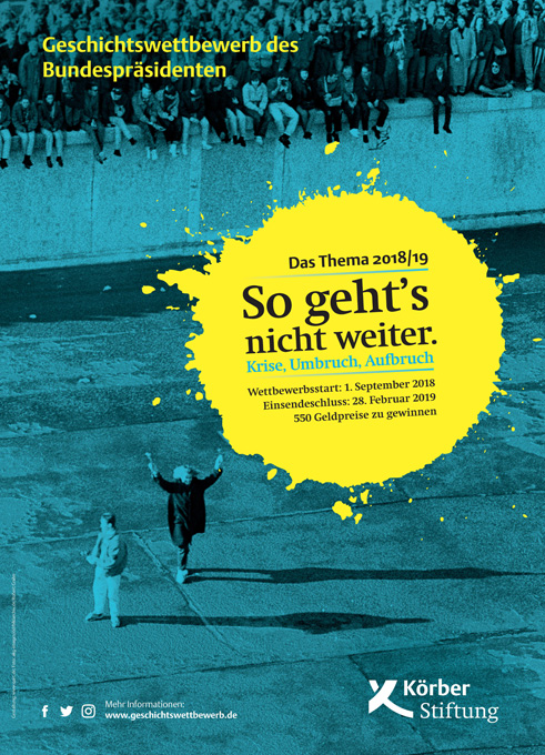 Der Bundespräsident und die Körber-Stiftung möchten mit dieser Ausschreibung Kinder und Jugendliche dazu anregen, historisch nachzuforschen, wie die Menschen mit Krisen umgegangen sind, welche Auswirkungen sie auf das Zusammenwirken hatten und wie aus einem Umbruch ein Aufbruch werden konnte – am Beispiel der eigenen Lokal- oder Familiengeschichte.