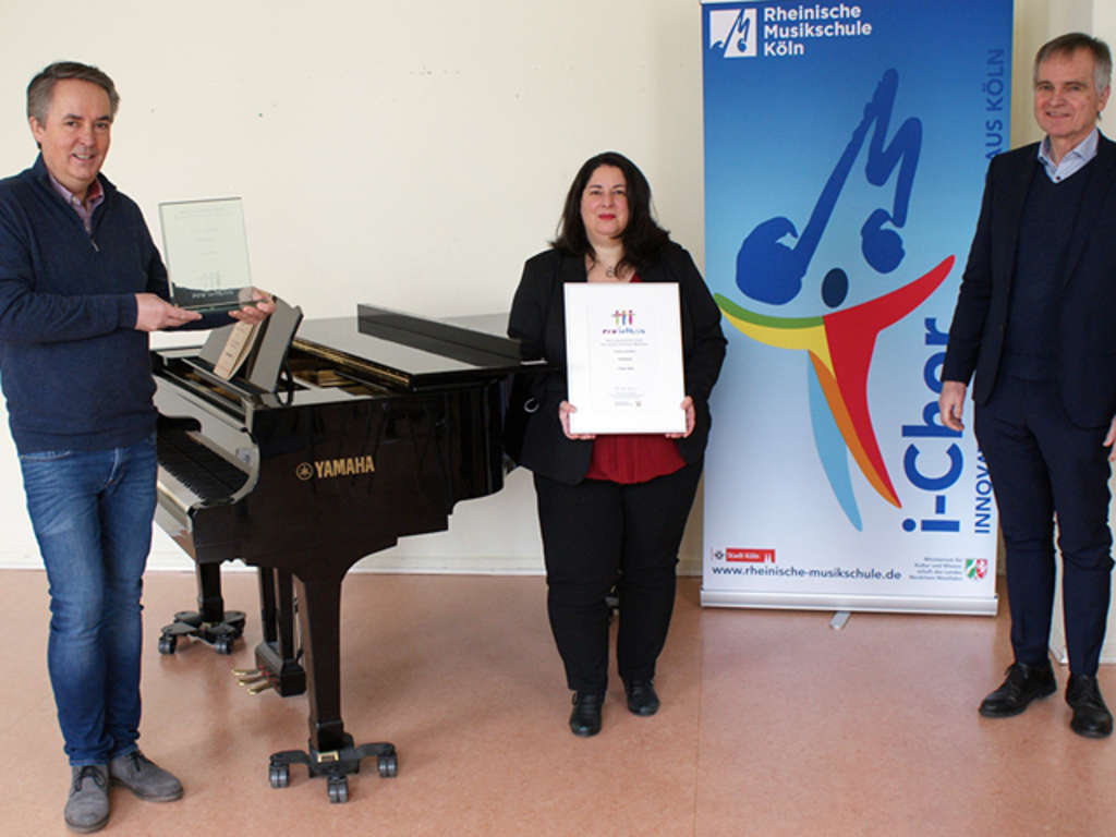 Im Dezember 2020 hat der Minister für Arbeit, Gesundheit und Soziales des Landes Nordrhein-Westfalen, Karl-Josef Laumann, unseren i-Chor mit dem Inklusionspreis in der Kategorie Freizeit und Kultur für sein Engagement um ein selbstverständliches Miteinander von Menschen mit und ohne Behinderung ausgezeichnet. Der i-Chor steht für ein innovatives und inklusives Ensemble, bei dem alle mitmachen können. Auf dem Foto präsentieren Michael Kokott, Leiter des i-Chores, und Andrea Becker, verantwortlich für das inklusive Chormanagement, zusammen mit Dr. Tilman Fischer, dem Direktor der Rheinischen Musikschule, den Preis.