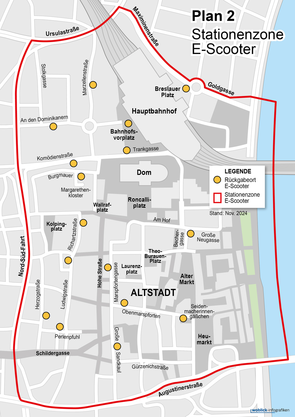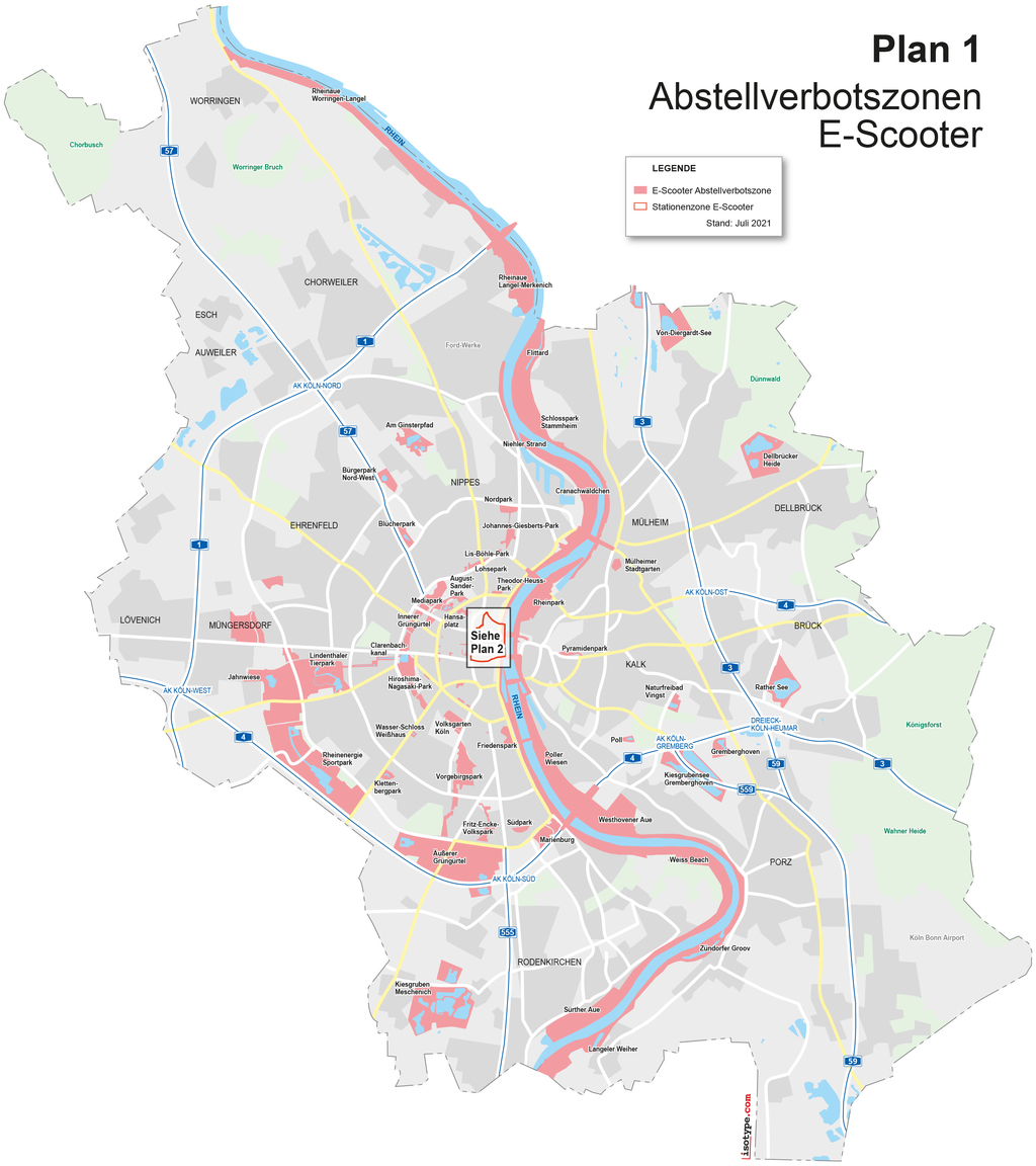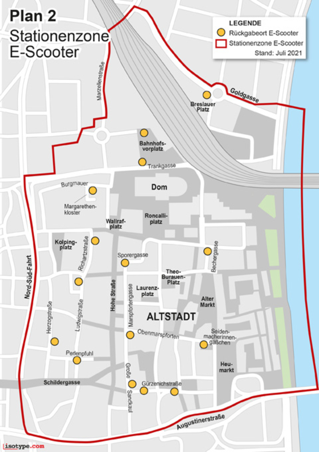 Die Verleihfirmen definieren das Bedienungsgebiet selbst. Die Nutzung eines E-Scooters ist im Stadtgebiet nicht begrenzt. Sie dürfen den E-Scooter allerdings nur innerhalb des von der Verleihfirma festgelegten Bedienungsgebietes abstellen. Diese Bedienungsgebiete erstrecken sich nicht über das gesamte Stadtgebiet und unterscheiden sich je nach Verleihfirma.