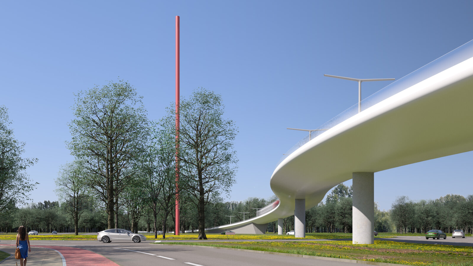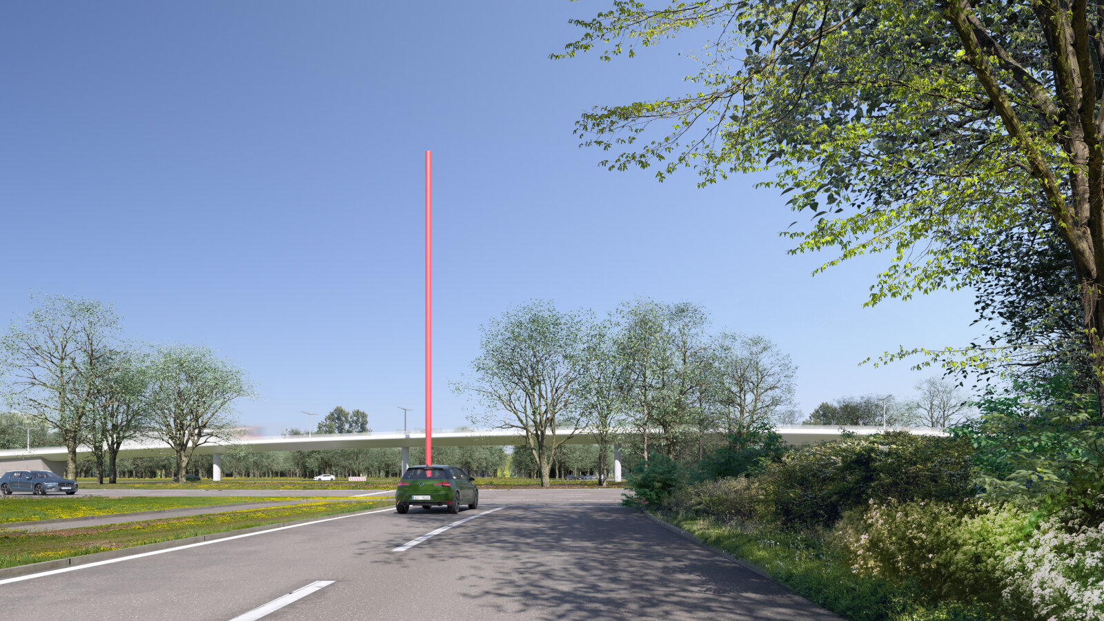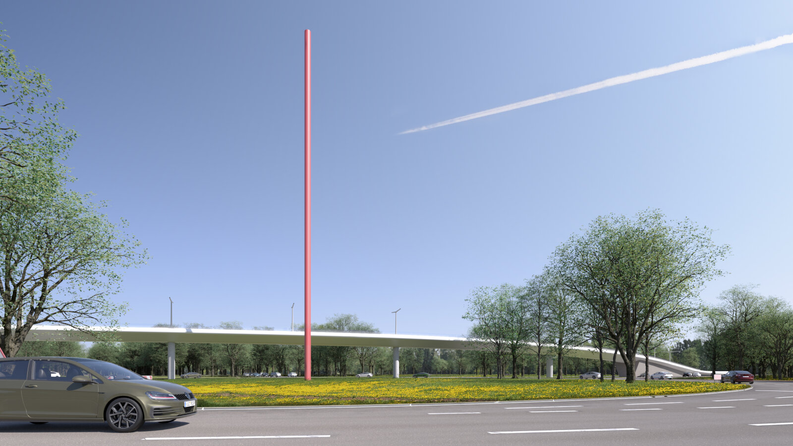 Der vom Rat im Herbst 2023 beschlossene Brückenentwurf erfüllt die Ansprüche an die städtebauliche Gestaltung, den Verteilerkreis Süd und das Kunstwerk Standortmitte optimal. Er zeichnet sich durch eine optisch besonders leicht wirkende Konstruktion aus. Das geplante Bauwerk führt am Kunstwerk Standortmitte vorbei. Eine respektvolle Verbindung von Stadtbahn und Kunst war uns daher sehr wichtig. Insgesamt zeichnet sich die Brücke durch maximale Transparenz und minimale Störung des Landschaftsbildes aus.