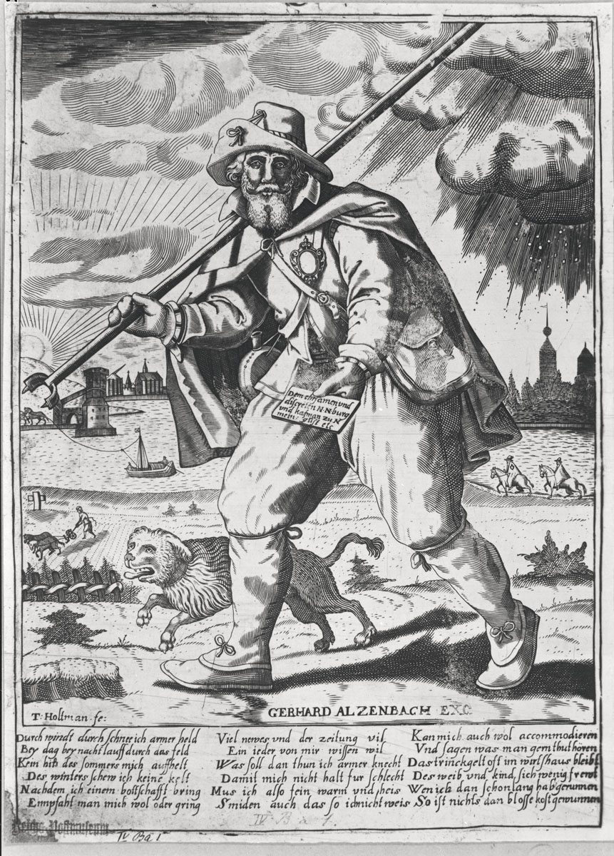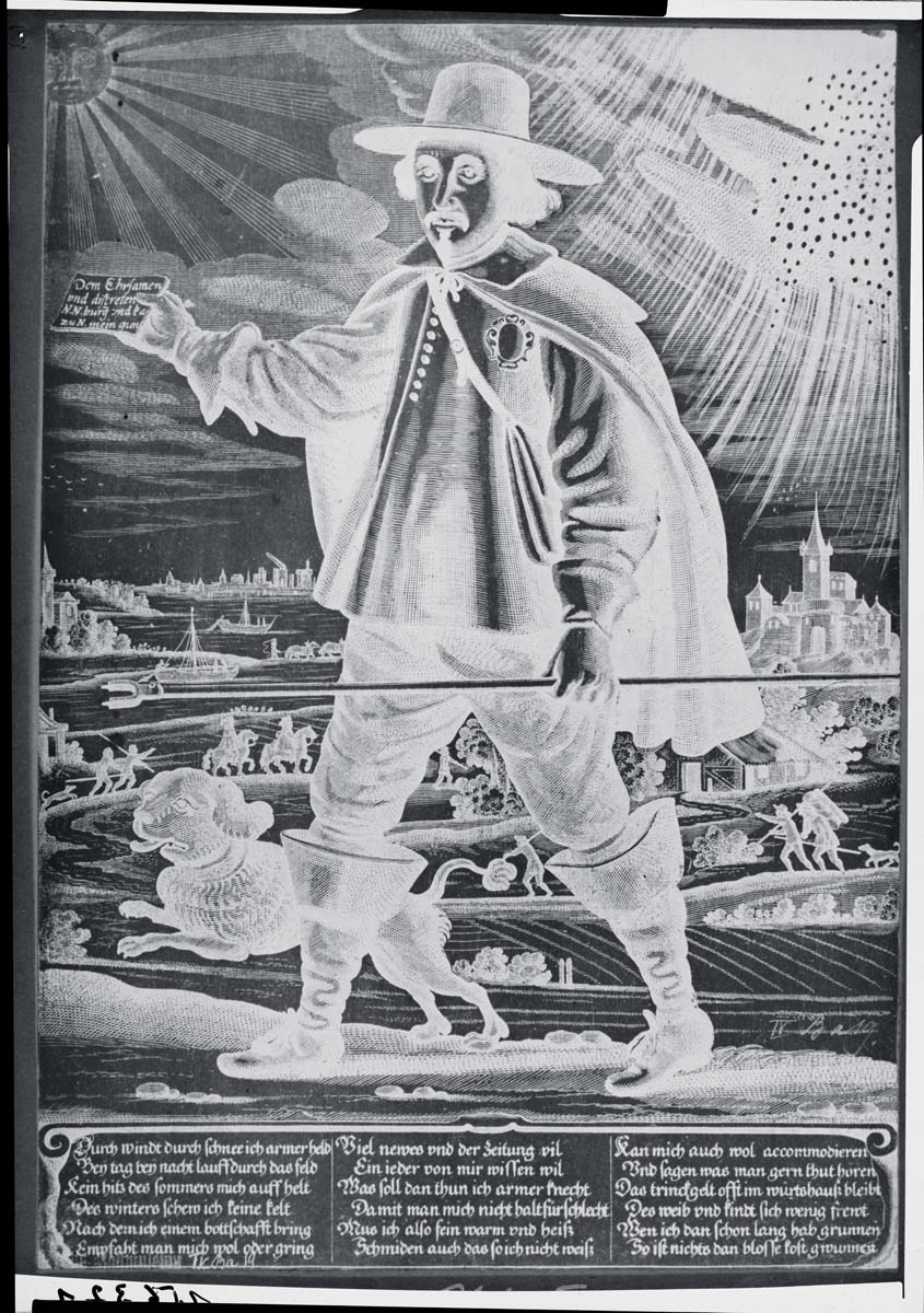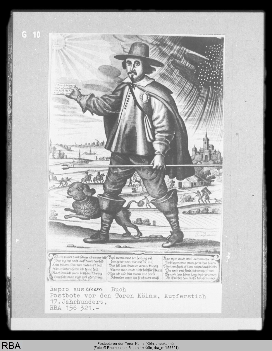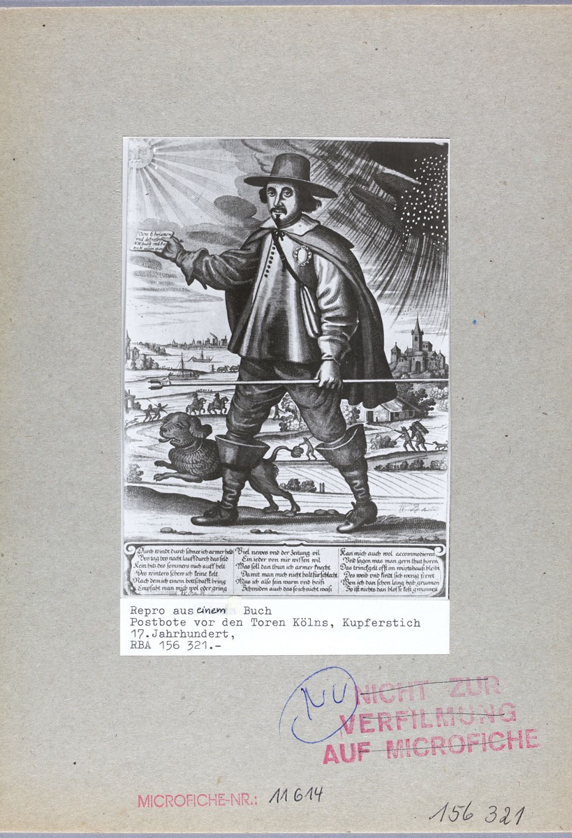 Darunter befand sich in der Abteilung B, Raum 68 zum Thema "Post" auch ein Kupferstich aus dem Reichspost-Museum Berlin. Der 187 x 272 Millimeter große Kupferstich mit einem Postboten wurde etwa um 1650 von dem Nürnberger Verleger Paul Fürst (1606-1666) veröffentlicht. Die formatfüllende Figur in Stiefeln, Hut und Mantel mit Botenschild und Botenspieß läuft in Sonnenschein, Regen und Schnee durch eine weitläufige Flusslandschaft. Am Horizont ist die Kölner Stadtsilhouette mit dem Kran auf dem noch nicht fertig errichteten Kölner Dom zu sehen.