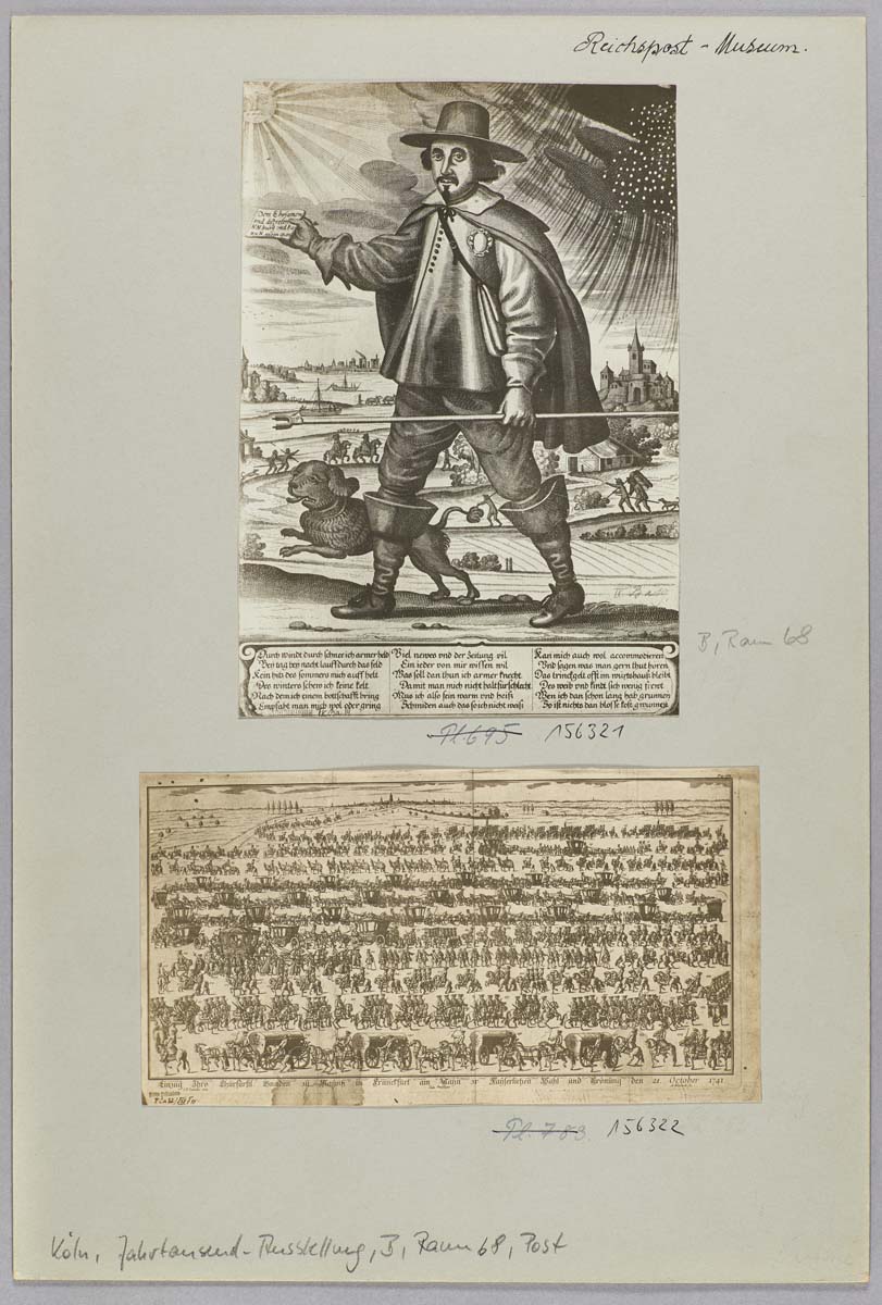 Boymann ordnete es nach der topographischen Systematik, die er im Marburger Bildarchiv kennengelernt hatte und aus der sich das bis heute gültige Kölner Spezialschema als Archivstruktur entwickelt hat. Der älteste erhaltene Barytabzug befindet sich in einer Serie auf hellgrauem Karton aufgezogener Positive, die die Jahrtausend-Ausstellung dokumentierte. Er gehörte höchstwahrscheinlich zu den ganz frühen Abzügen, die den Nutzern des Rheinischen Bildarchivs schon kurz nach der Bildarchivgründung im eigenen Lesesaal im Rheinischen Museum in Köln-Deutz vorgelegt wurden. Der Positivkarton, auf den er aufgezogen wurde, ist auf der Rückseite mit dem kleinen runden Stempel "Rheinisches Museum – Bildarchiv – Stadt Köln" versehen. Diesen Namen trug das Museum nur bis zu seiner Umbenennung in "Haus der Rheinischen Heimat" 1936. Unter dem Baryt-Abzug ist eine alte, inzwischen durchgestrichene Signatur Pl. 695 notiert, sowie die RBA-Nummer 156 321. Der Positivkarton weist oben in schwarzer Tusche auf die Herkunft des Kupferstichs hin: "Reichspost-Museum". Eine Recherche in der Digitalen Objektdatenbank der Nachfolgeeinrichtung dieses Museums, der Museumsstiftung Post und Telekommunikation in Berlin, liefert einen Treffer:
