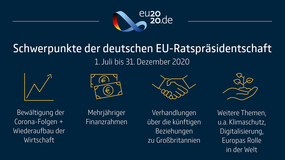 Vom 1. Juli bis 31. Dezember 2020 hat Deutschland die EU-Ratspräsidentschaft inne.