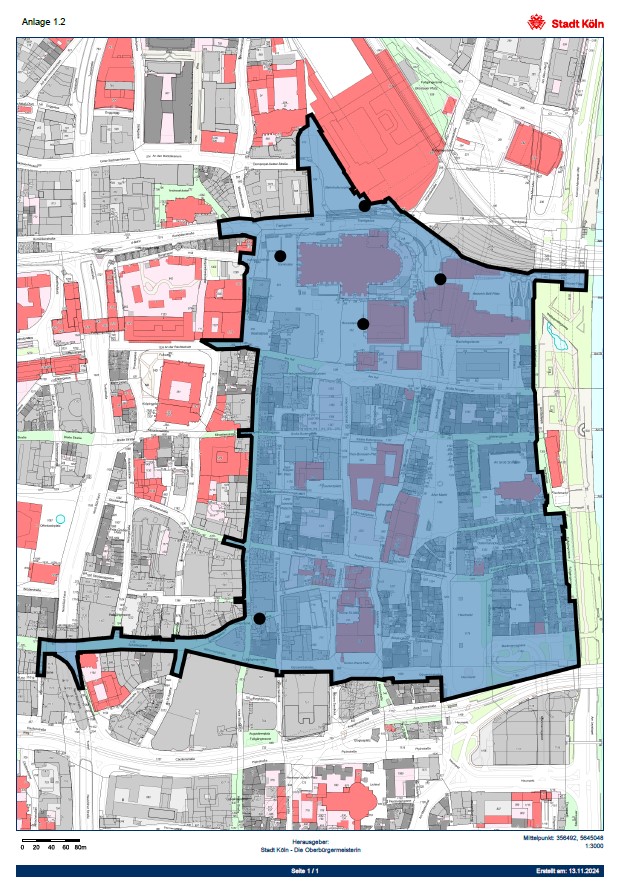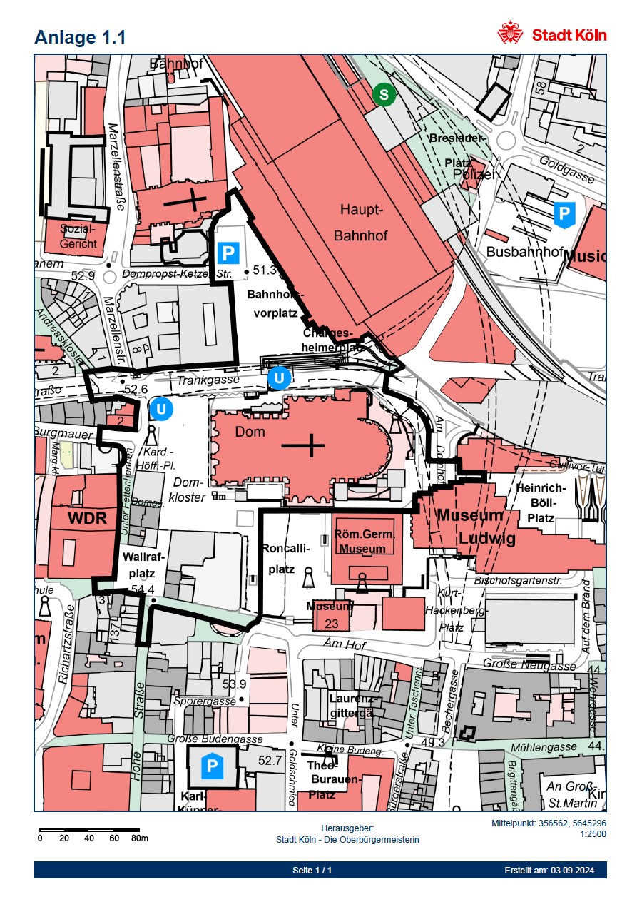 - Südseite "Schildergasse" ab "Antonsgasse" bis "Gürzenichstraße", "Heumarkt", "Augustinerstraße",