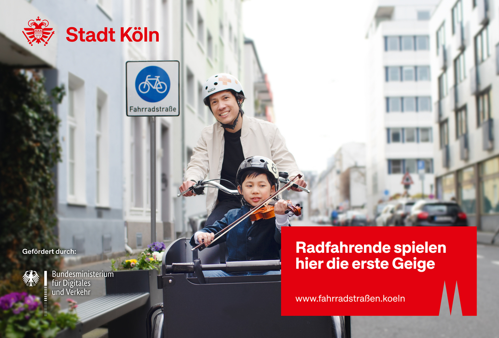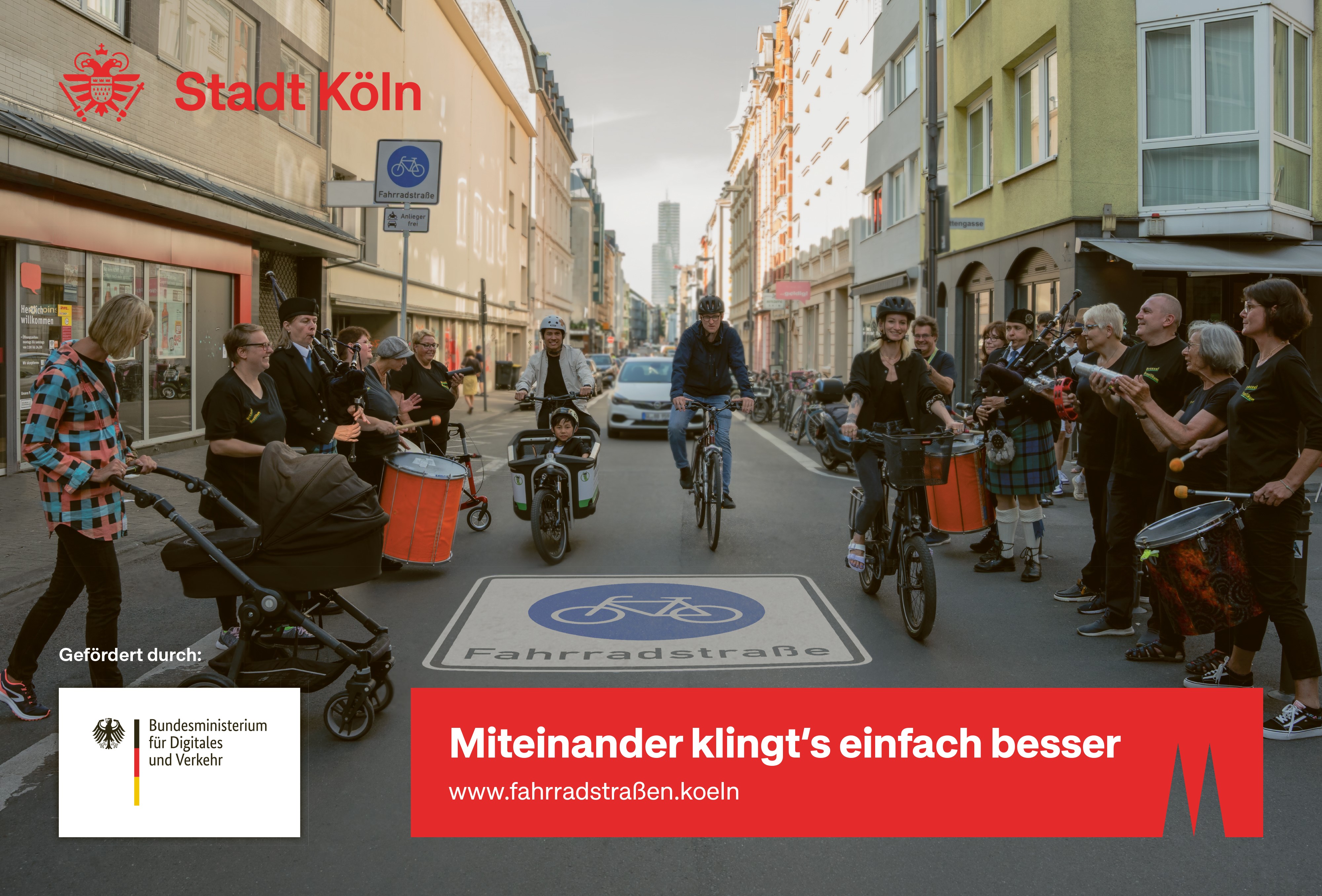 Um die Regeln, die in einer Fahrradstraße gelten, zu erklären haben wir die Kampagne "Hier spielt eine andere Musik" ins Leben gerufen. Damit möchten wir erreichen, dass alle Verkehrsteilnehmenden die Regeln kennen und das Miteinander aller Mobilitätsarten in der Fahrradstraße entspannt erleben können. Das Besondere: Die Regeln werden von Kölner*innen, die gleichzeitig leidenschaftliche Musiker*innen- und Radfahrer*innen sind, mit Assoziationen aus der Musikwelt erklärt.