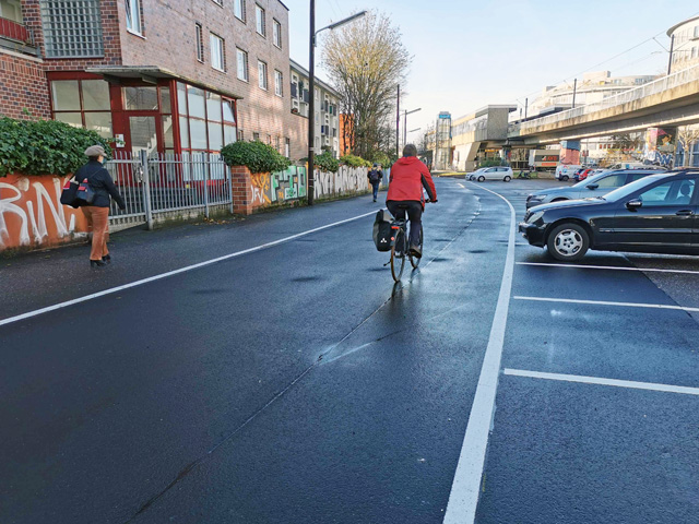 - Den Radweg führen wir weiter bis zur Boltensternstraße. Zwischen Amsterdamer Straße und Boltensternstraße verläuft der Fuß- und Radverkehr nördlich, parallel zur Stadtbahntrasse auf dem bestehenden Damm entlang.