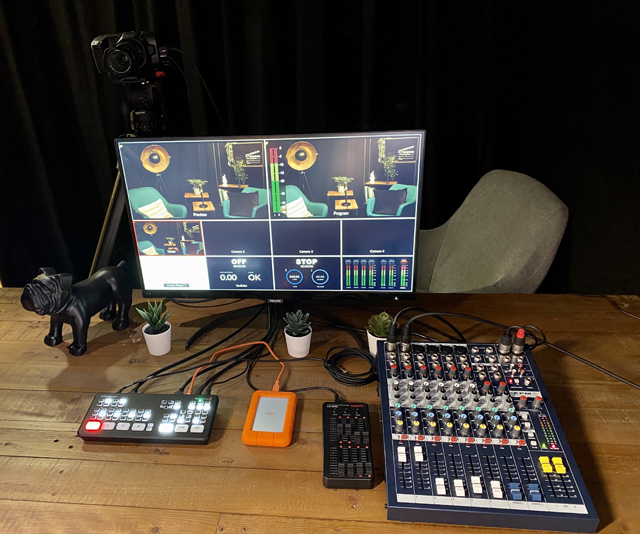 DMX-Controller: Swit LA-WR8 Tx plus + 3Rx Wireless DMX - Video- und Audio-Mischer: Blackmagic ATEM Mini Pro