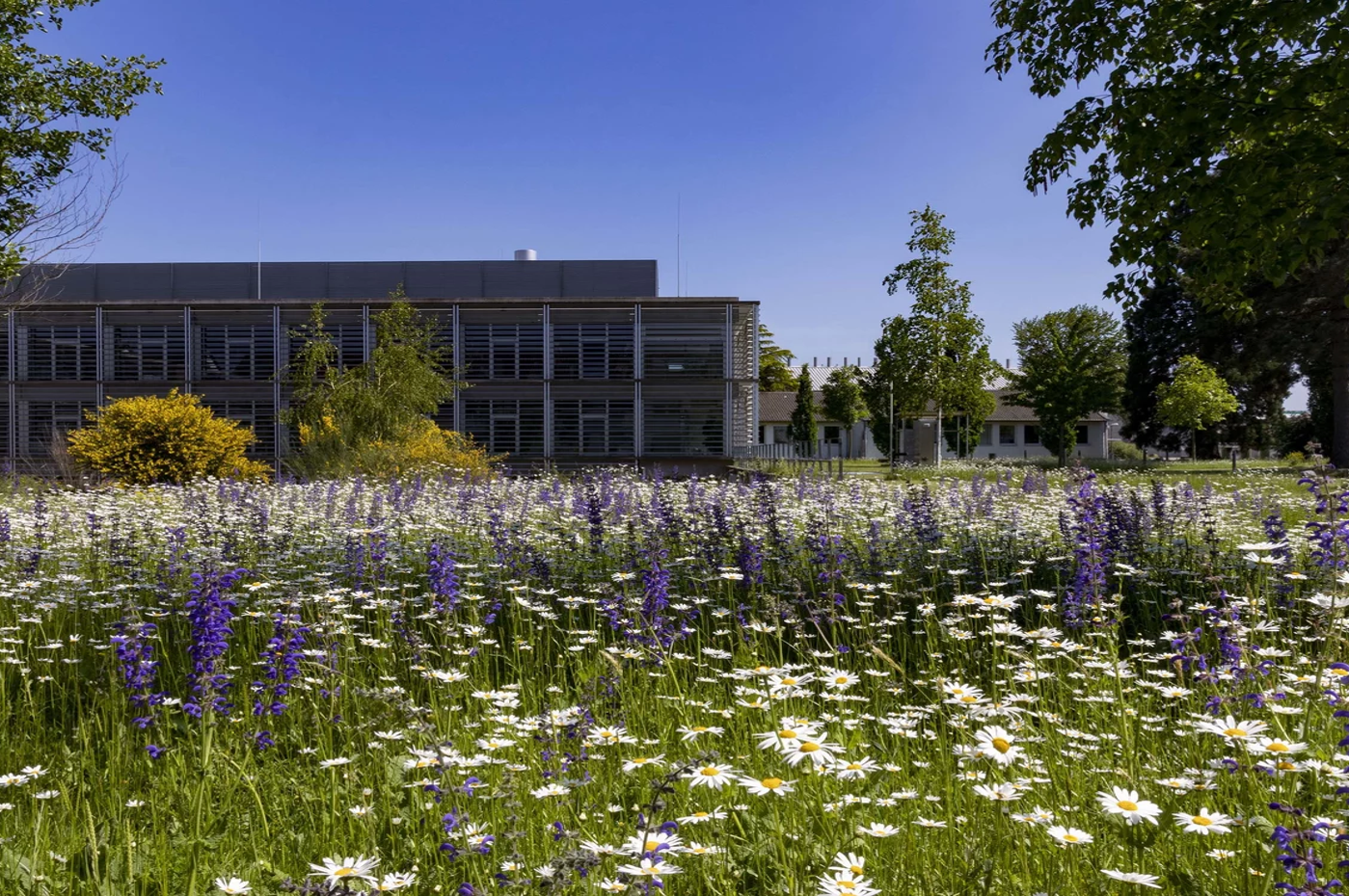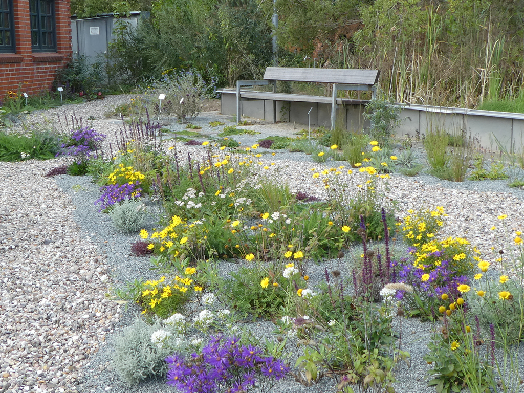 Mit bunten Hochstaudenbeeten wurden vorzeigefähige Naturbereiche angelegt, die auch die Firmenführung überzeugen konnten. Auch auf dem restlichen Gelände wird Natur zunehmend größer geschrieben. Mit Blühstreifen statt Vielschnittrasen werden sukzessive neue Lebensräume geschaffen.