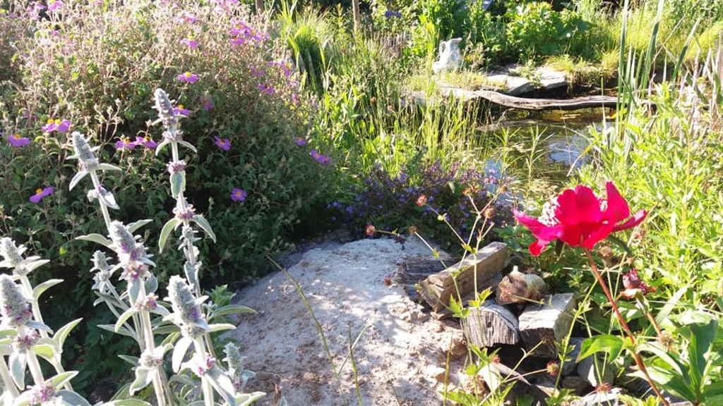 Mit Nisthilfen, heimischen Stauden und einem kleinen Teich bietet dieser Hausgarten Refugien für viele Arten.