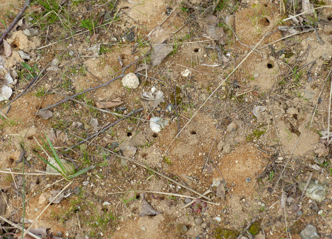 Da über 75 Prozent aller Wildbienen im Boden nisten, kann man ihnen mit einer vegetationsfreien Fläche wichtige Nistplätze schaffen. Diese Flächen sollten dabei mindestens 40 cm tief 0,5 qm groß sein und mit ungewaschenem Sand/Silt Lehm oder Erde gefüllt sein. Die Fläche sollte dauerhaft von höherer Vegetation freigehalten werden, indem die Pflanzen auf Bodenhöhe abgeschnitten werden. Da manche Wildbienen in größeren Gruppen nisten, kann es sein, dass sich im Frühling oder Sommer kleine Scharen dort tummeln. Aber keine Angst, Wildbienen sind für uns Menschen nicht gefährlich. Auch andere seltene und interessante Tiere wie Ameisenlöwen, Sandlaufkäfer, Eidechsen und andere Reptilien nutzen die kleinen Sonneninseln gerne. In Kombination mit Lesesteinhaufen/Mauern oder einer Kräuterspirale werden diese Stellen oft zu Hotspots für sonst eher seltener zu sehende Arten.