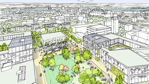 Diese umschließen einen großzügigen begrünten Platz, auf den auch die Mensa orientiert ist. Insgesamt sind in den Neubauten rund 45.000 Quadratmeter Nutzfläche geplant. Dazu gehören neben den Büros und Laboren der Fakultätsgebäude auch ein großes Hörsaalgebäude, eine bereits bestehende Bibliothek und die zentrale Mensa.